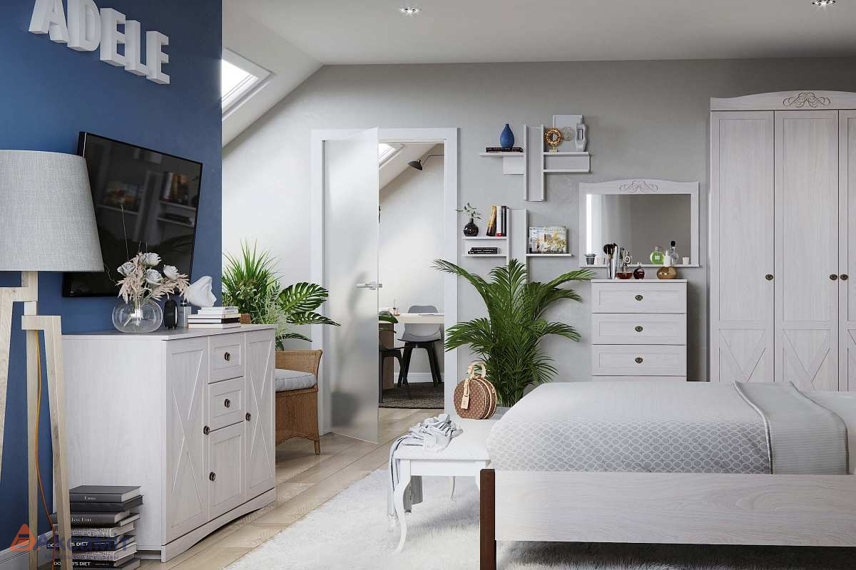 Одной из отличительных особенностей коллекции ADELE являются виньетки на изголовье кроватей, зеркале и карнизах, выполненные методом ультрафиолетовой печати. Это гарантирует экологичность и стойкость к истиранию.