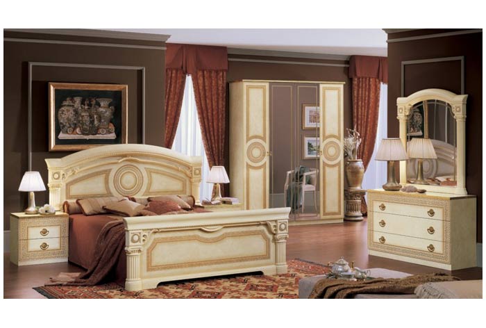 Светлые тона слоновой кости придадут помещению мягкость и воздушность. Комплектация спальни «Аида Айвори» Голд: шкаф, кровать, прикроватные тумбы, комод с зеркалом.