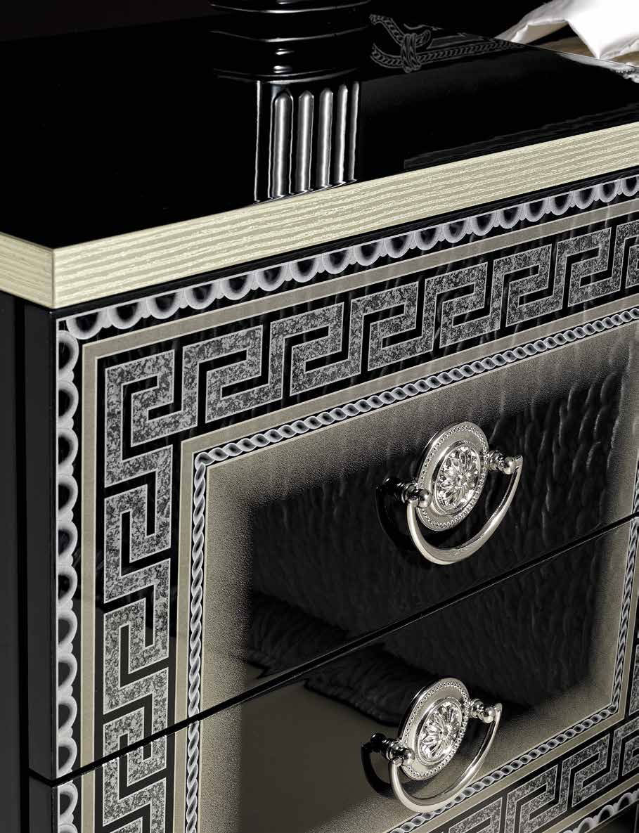 Фасады мебели представлены в покрытии высококачественной белой матовой и глянцевой лакировкой. Блестящие поверхности мебели особенно элегантно подчеркивают стальные элементы декора, фурнитура и зеркала.