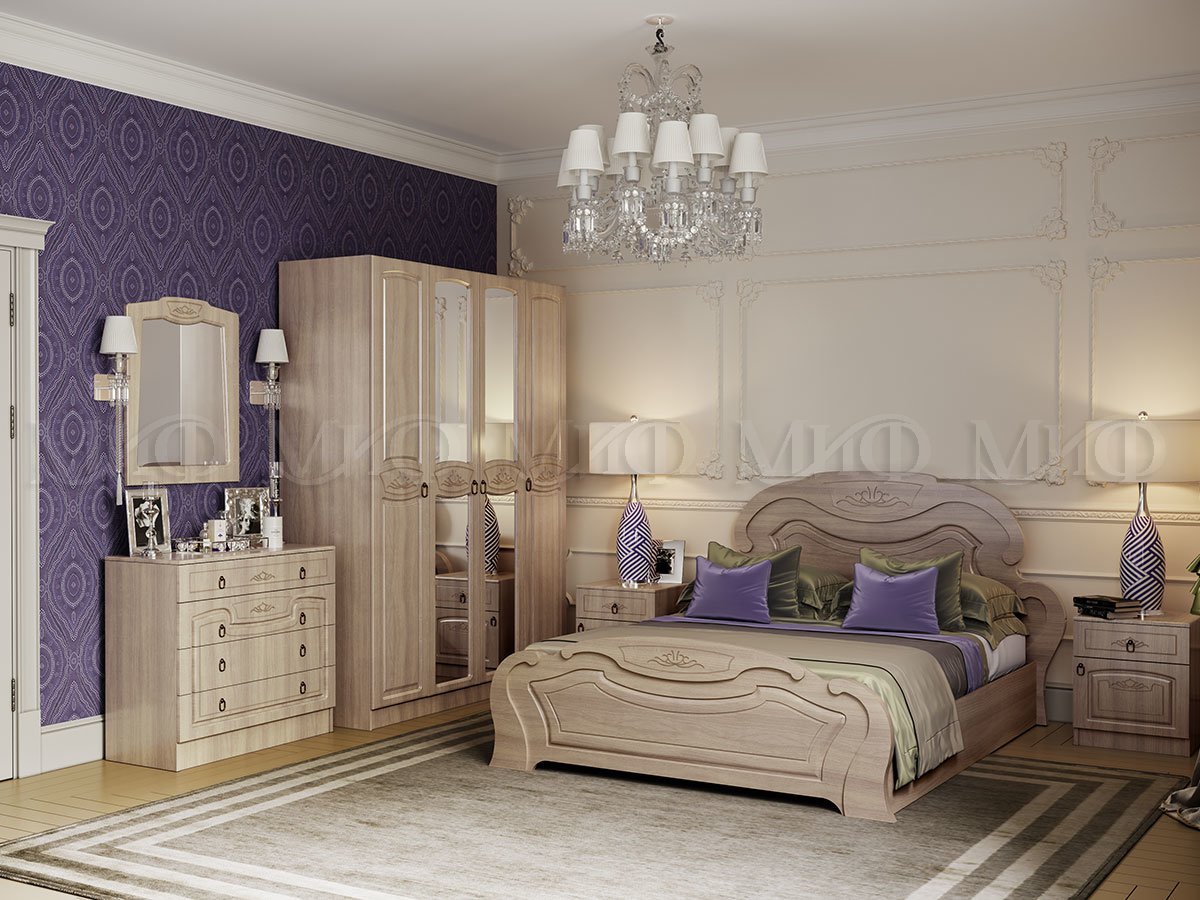 Полный комплект: шкаф, кровать двуспальная, комод, две прикроватные тумбы.