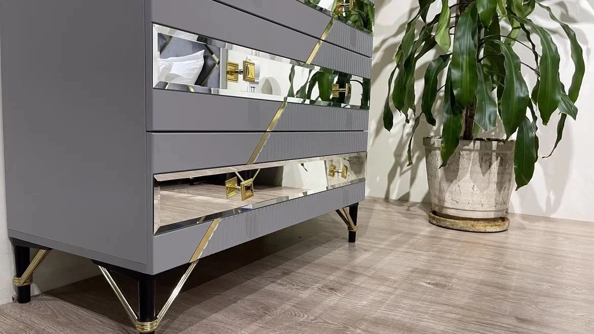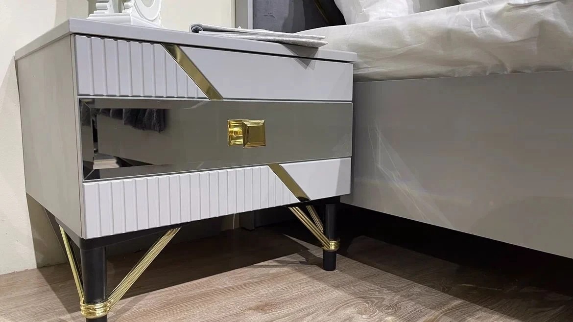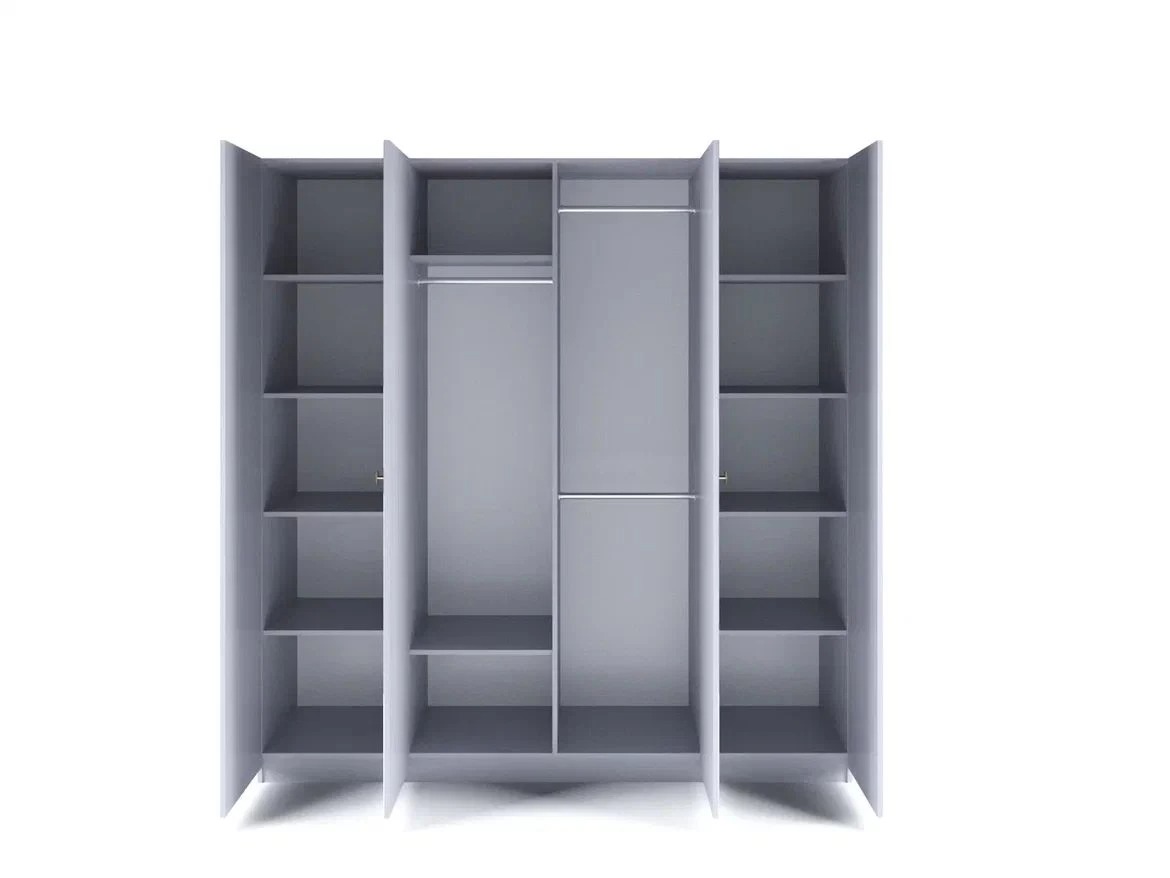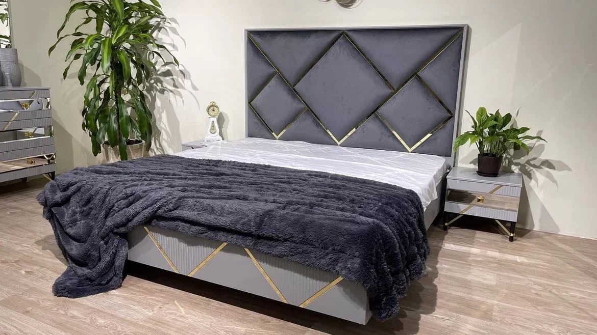 Спальня Ализе 4 дв в сером цвете/ без основания под матрас возможные цветовые решения: Характеристики: Цвет: серый Материал фасадов: МДФ, ЛДСП, фигурные накладки из высокопрочного ППУ. Покрытие: Глянцевое лаковое покрытие с шелкографией. Корпус: ЛДСП Петли с доводчиками. Направляющие для ящиков: Металлические полного выдвижения. Покрытие изголовья Велюр. Габаритные размеры: Шкаф 4-х .дверный: 2000/600/2100(ШхГхВ) Комод: 960/450/930(ШхГхВ) Зеркало:900/20/1000(ШхГхВ) Тумба: 476/400/441(ШхГхВ) Кровать: 1888/2054/1450(ШхГхВ) Под матрас 1800х2000