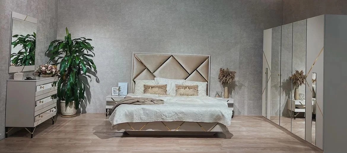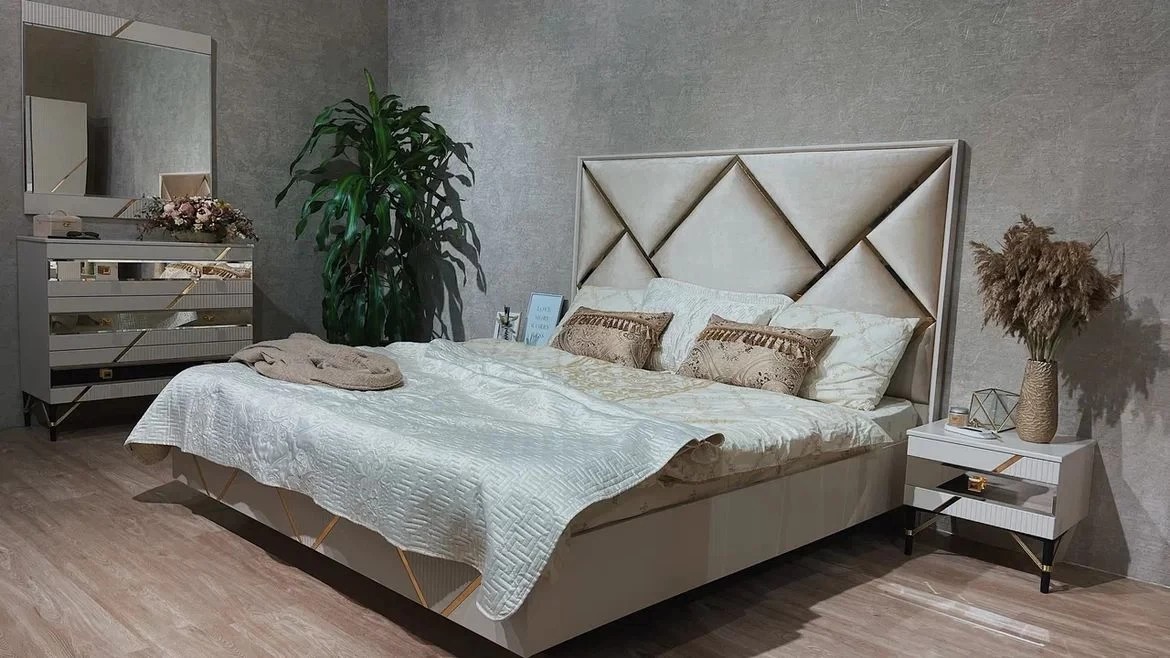 Спальня Ализе 4 дв в сером цвете/ без основания под матрас возможные цветовые решения: Характеристики: Цвет: сатин Материал фасадов: МДФ, ЛДСП, фигурные накладки из высокопрочного ППУ. Покрытие: Глянцевое лаковое покрытие с шелкографией. Корпус: ЛДСП Петли с доводчиками. Направляющие для ящиков: Металлические полного выдвижения. Покрытие изголовья Велюр. Габаритные размеры: Шкаф 4-х .дверный: 2000/600/2100(ШхГхВ) Комод: 960/450/930(ШхГхВ) Зеркало:900/20/1000(ШхГхВ) Тумба: 476/400/441(ШхГхВ) Кровать: 1888/2054/1450(ШхГхВ) Под матрас 1800х2000