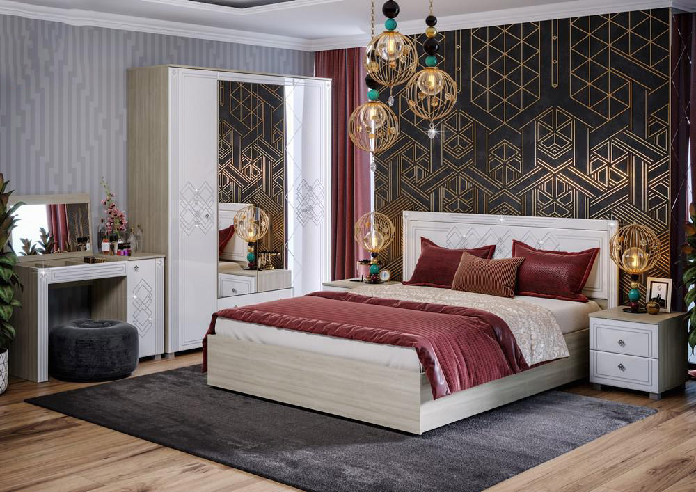 В набор для спальни входит шкаф, кровать, прикроватная тумба, туалетный столик и зеркало. На фасадах присутствуют стразы. Дополнительно можно заказать подъемный механизм.