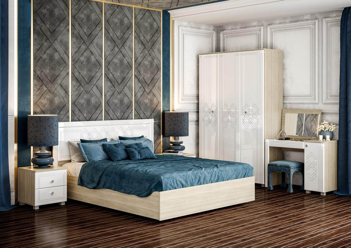 Современный дизайн под классический стиль. В комплекте есть все, что необходимов спальне: шкаф, кровать, зеркало, прикроватная тумба и комод. При желании можно дополнительно заказать подъемных механизм для кровати.