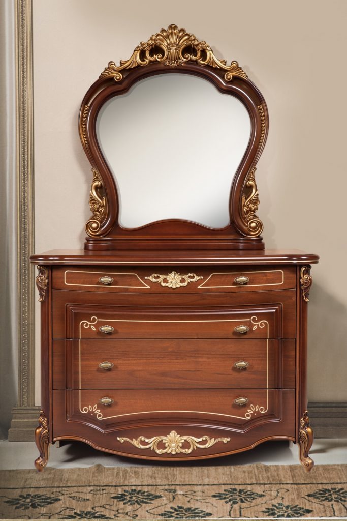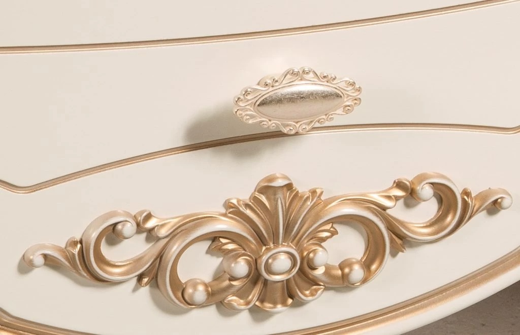 СПАЛЬНЯ «АМЕЛИ 5К» С КОМОДОМ Цвет: слоновая кость с золотой патиной, орех. Варианты цвета мягкого элемента: бежевый Предметы коллекции спальни АМЕЛИ 5К Шкаф Н2490 х В2543 х Т645 Кровать Н1558 х В2236 х Т2180 (спальное место: 1800 х 2000) Тумба прикроватная Н650 х В620 х Т470 Комод Н876 х В1170 х Т512 Зеркало в раме Н981 х В844 х Т100