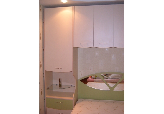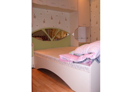 Дополнительно: Корпус - ДСП ламинированное «Kronopol» (Польша) – цвет "клён натуральный". Фасады - ДСП ламинированное «Kronopol» (Польша) – цвет "зелёный светлый", "бежевый светлый". Кровать 2-х спальная, с зеркальными вставками.