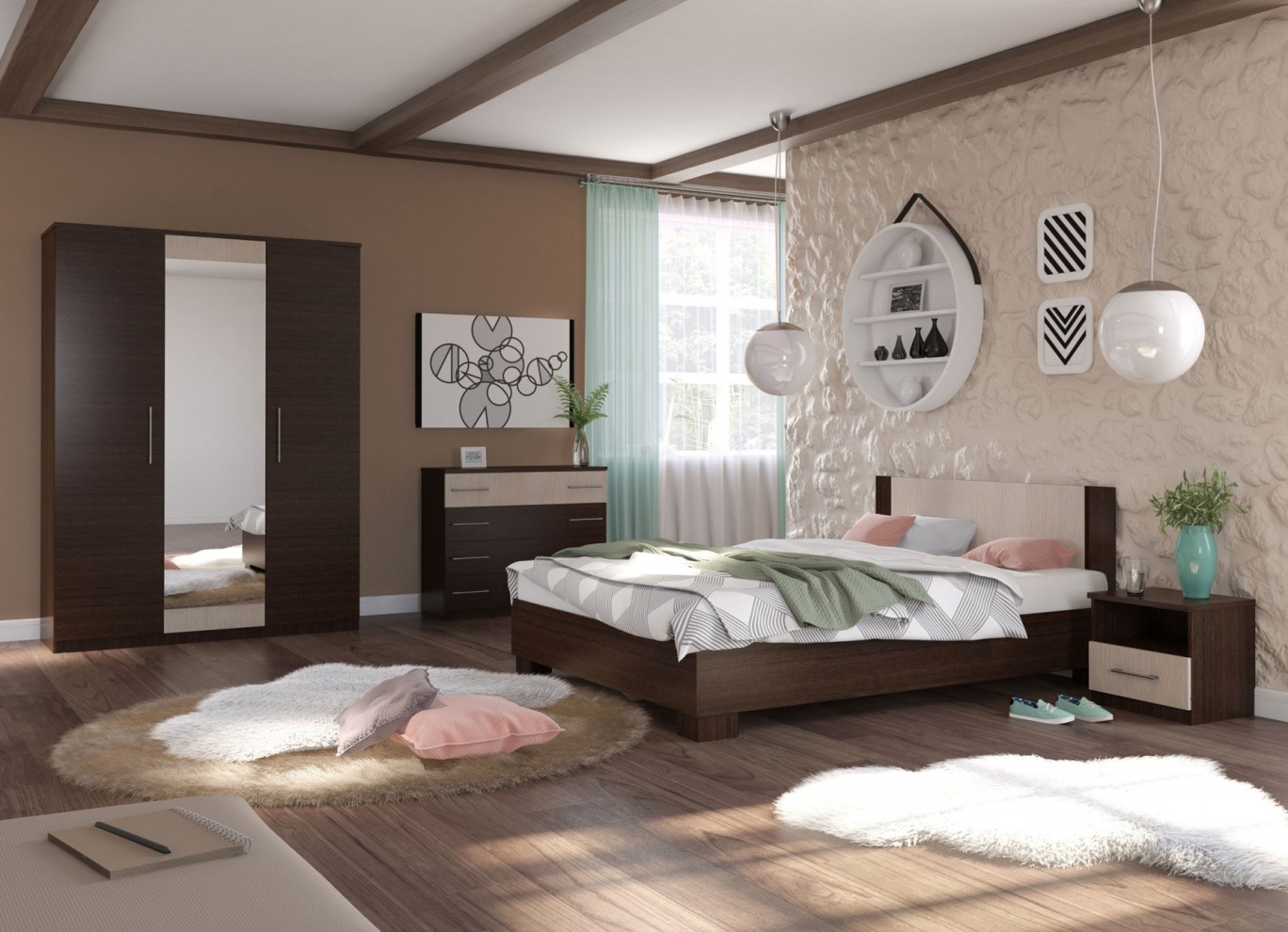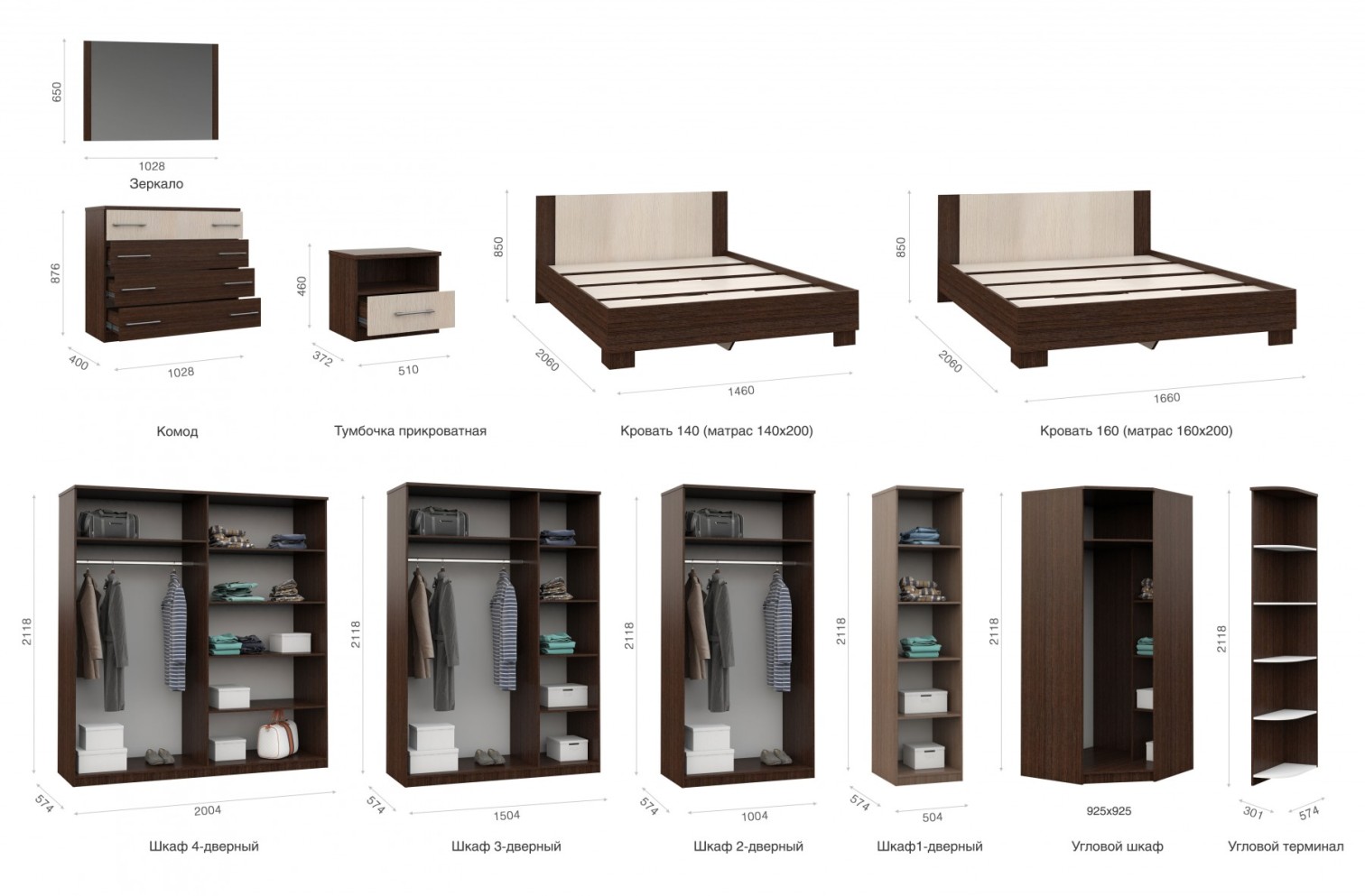 В наборе: кровать 160, комод, 2 тумбы, шкаф трехдверный.