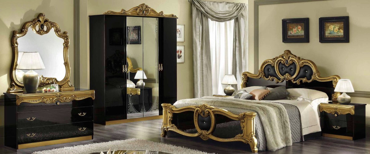 Роскошная барочная спальня в сочетании цветов черного глянца и рельефной позолоты декоративных элементов. Кровать с высоким фигурным изголовьем на невысоких ножках. Четырехстворчатый шкаф оборудован зеркальными дверцами по середине с пескоструйным узором и украшен резным карнизом. На широком комоде в три выдвижных ящика возвышается трюмо в богато украшенной раме.