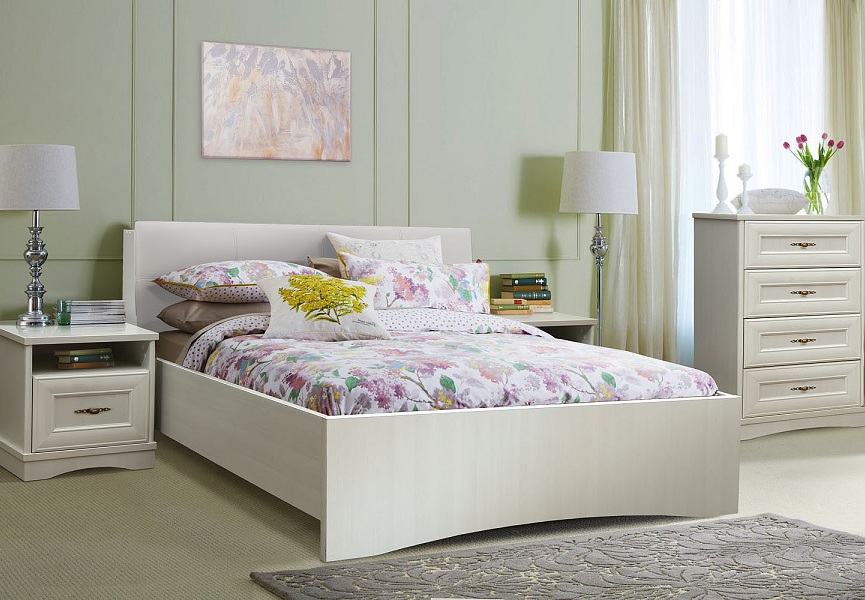 Гарнитур мебели для спальни включает в себя широкую двойную кровать П036.125М, стильный комод П036.27 и компактную прикроватные тумбы П036.28 - 2шт. Стилистическое единство набора, а также его изысканный дизайн позволяют привнести в интерьер вашей спальни атмосферу лёгкости в сочетании с комфортном. Комплект мебели будет прекрасно выглядеть при многоуровневом искусственном освещении.