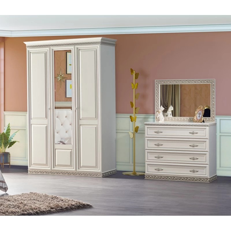 Мебельный гарнитур «Берта» – это нежный цвет, простота форм и строгая изысканность, которые никогда не утратят свою популярность. Коллекция выделяется строгими линиями в сочетании с утонченной резной отделкой. Здесь нет ничего лишнего, и в то же время не нуждается в дополнении. В состав гарнитура входят разнообразные элементы, поэтому вы можете без труда создать утонченную обстановку в доме.