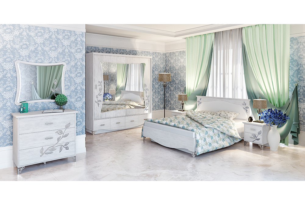 Набор мебели для спальни «Бристоль» выполнен в белом оттенке цвета северного дерева. Фасад украшен элегантными узорами на растительную тематику. Створки шкафа украшает широкое зеркало необычной формы.