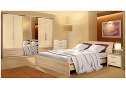 Комплектация: кровать двуспальная, тумба, шкаф двухстворчатый. Материал: ЛДСП.