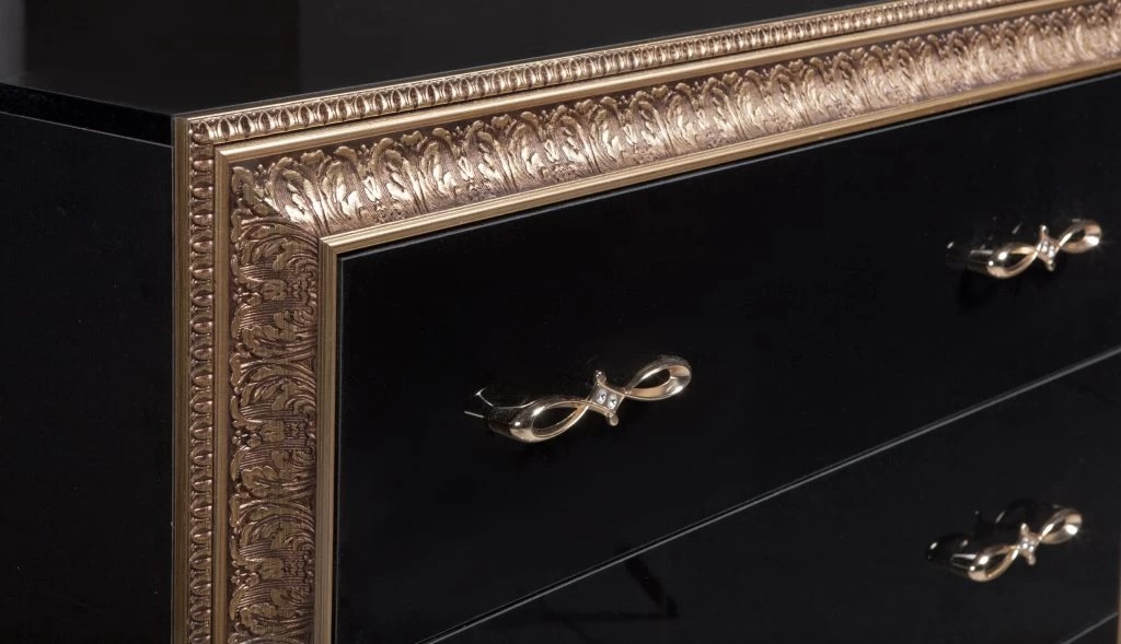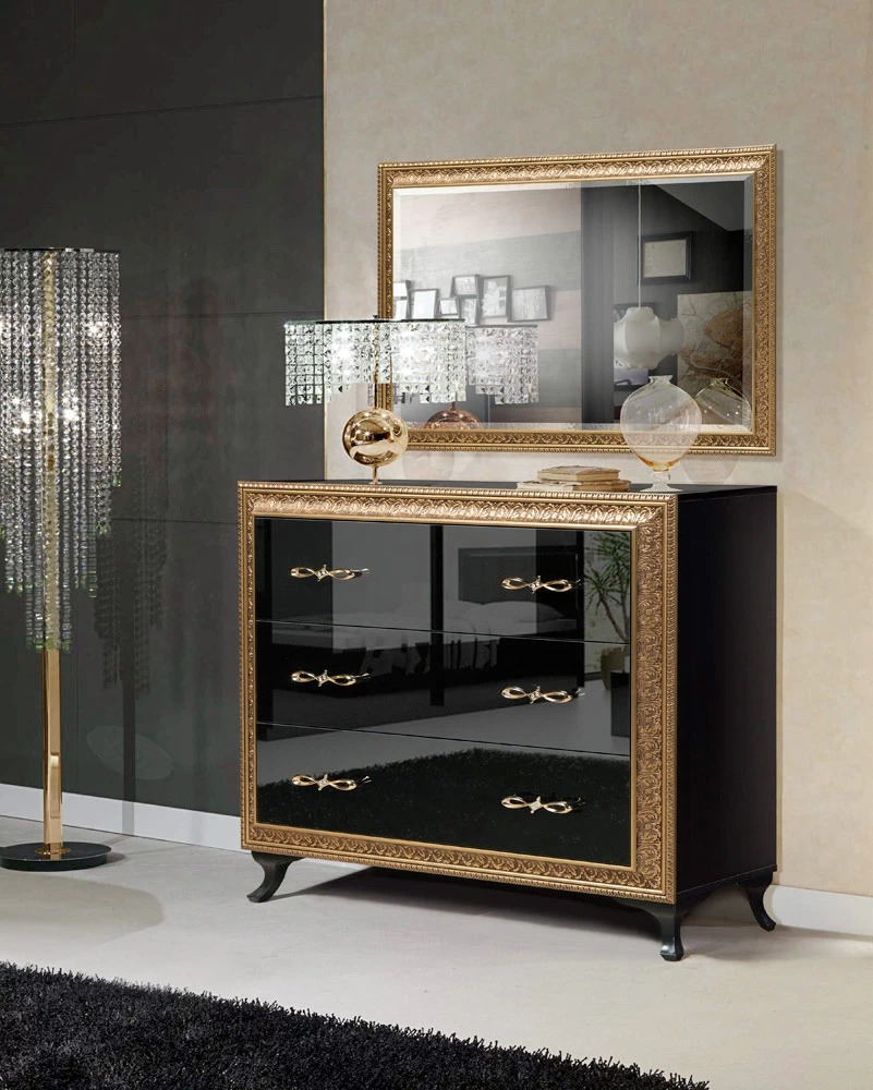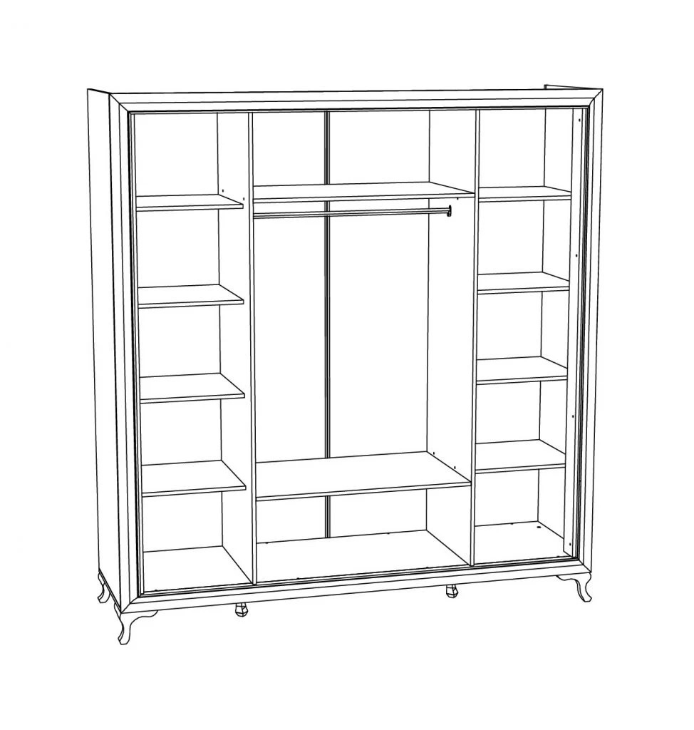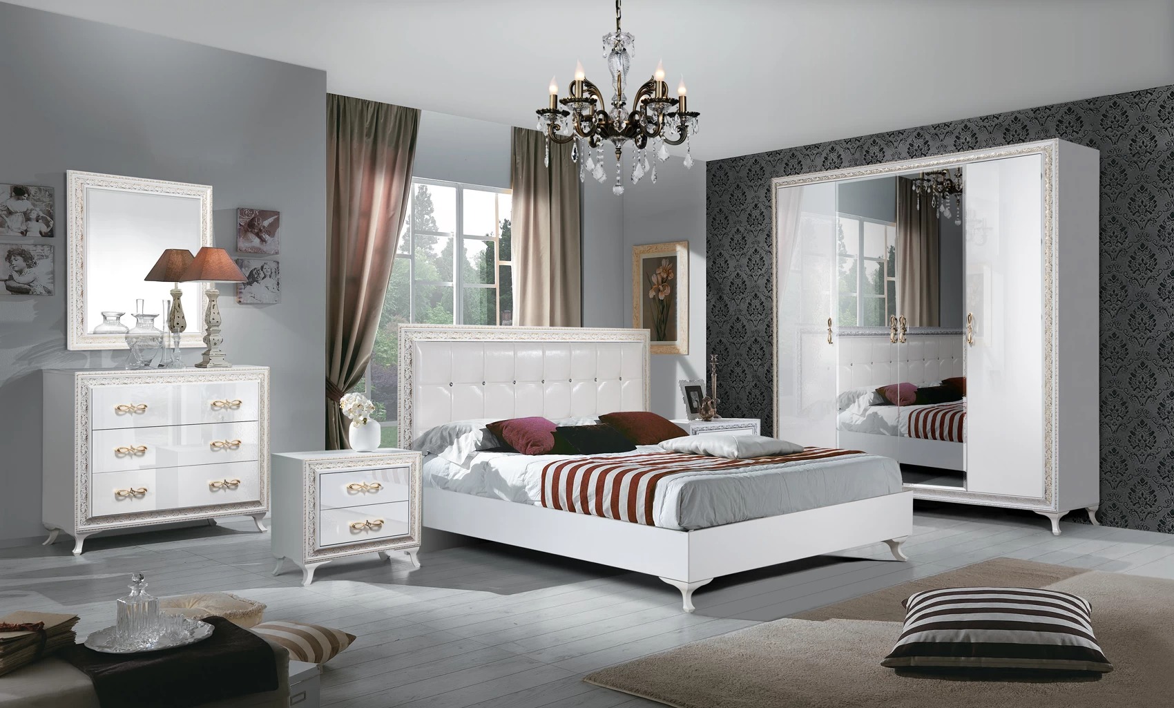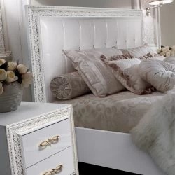 СПАЛЬНЯ «ДАНА» (ОТДЕЛКА СЕРЕБРО) Варианты цветового исполнения: белый (отделка багета — золото или серебро); черный (мягкий элемент кровати (эко-кожа) выполнен в черном цвете). Предметы коллекции спальни “Дана” Шкаф для одежды 4-х дверный H2254 х B2107 х T646 Кровать H1200 х B2000 х T2048 (спальное место: 1800 x 2000) Тумба прикроватная H684 х B665 х T486 Комод H1009 х B1134 х T486 Зеркало в раме H872 х B1120 х Т55