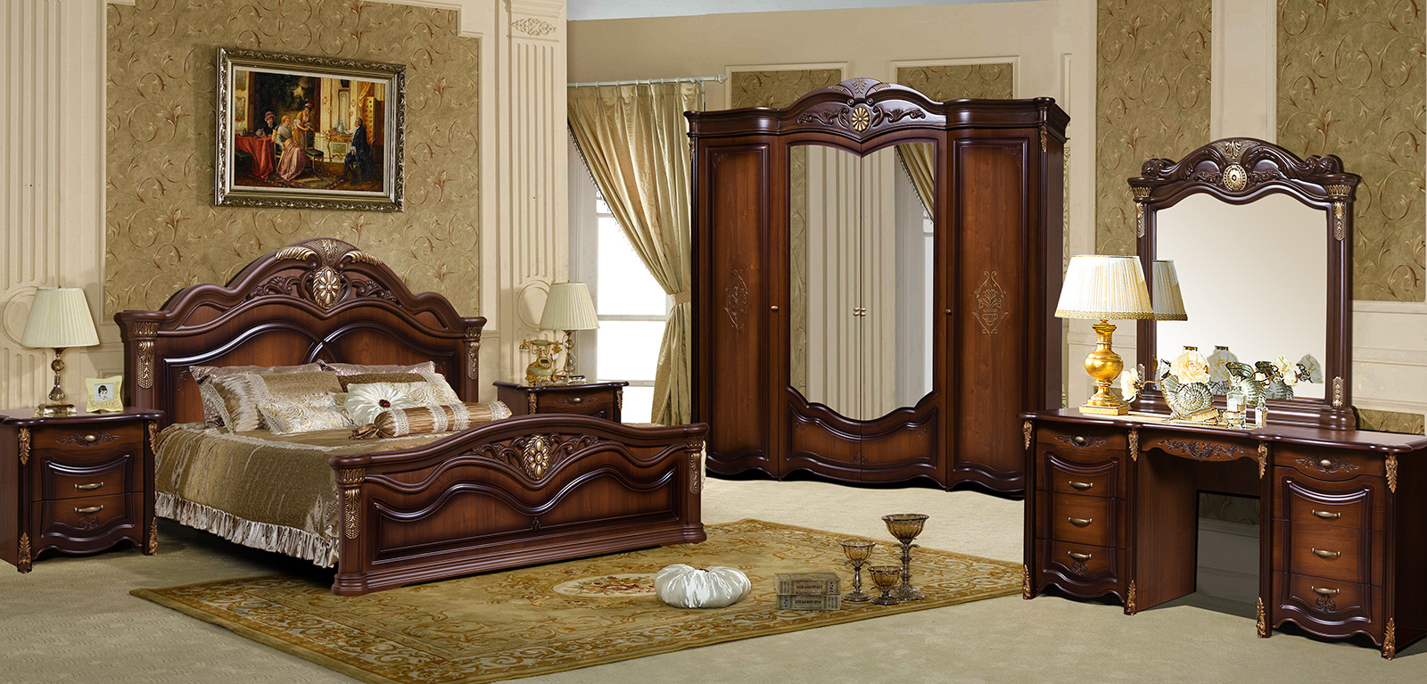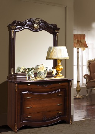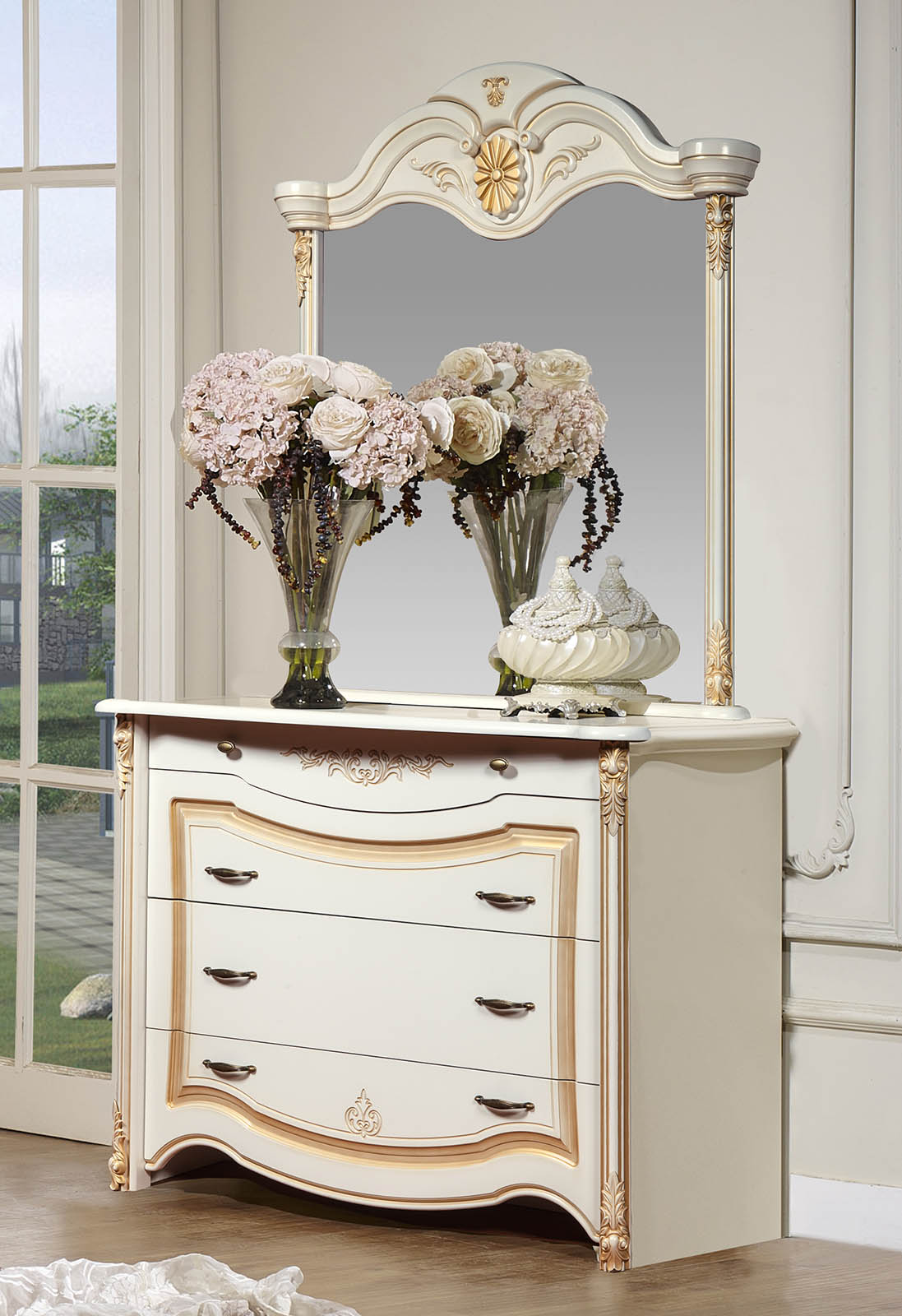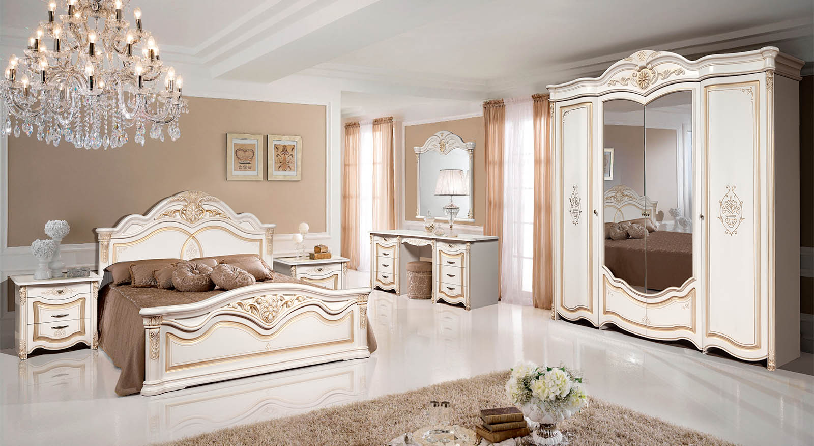При изготовлении спальни Torriani Avorio используется шпон липы и массив ореха, из которого выполнены карнизы и другие резные декоративные элементы. Кровати имеют художественно перфорированные спинки.