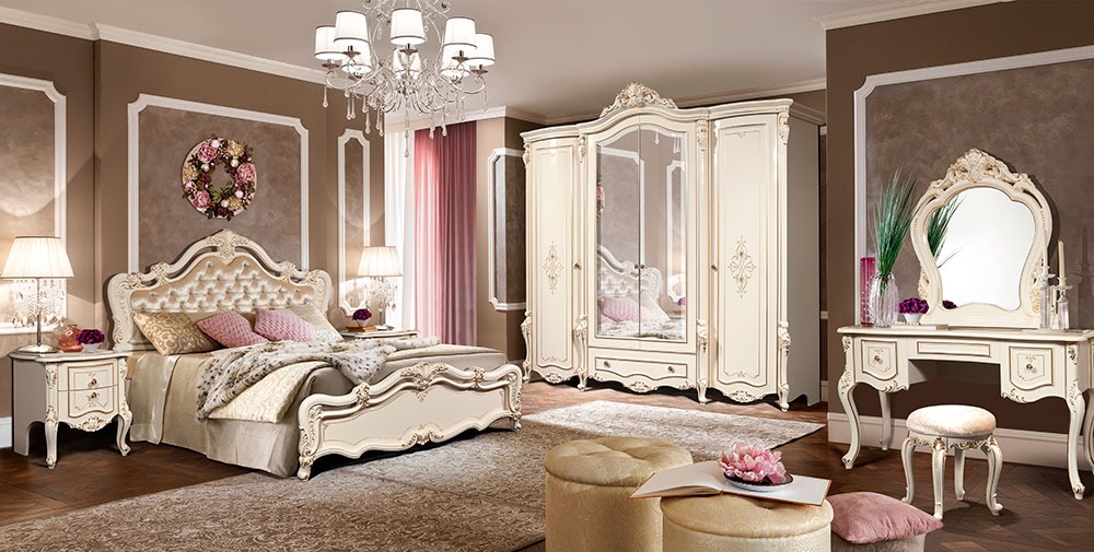 Состав комплекта: комод, шкаф, двуспальная кровать, тумба (2 шт).