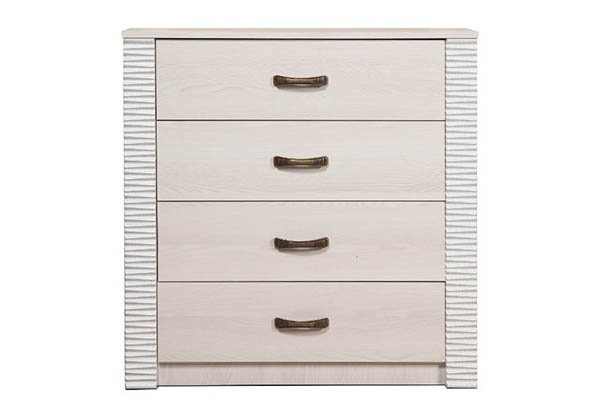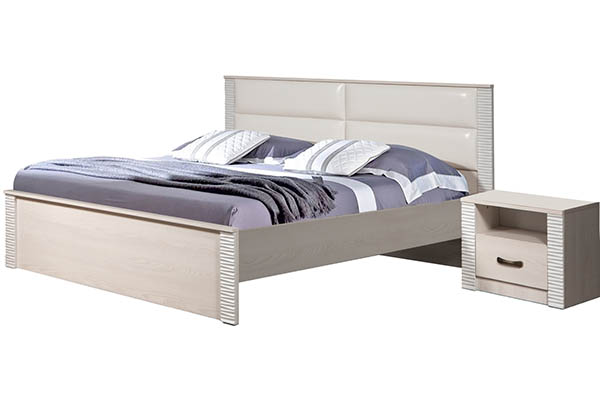 Гарнитур в однотонном исполнении выделяется фрезерованными вставками на фасадах и ручками бронзового цвета. В указанную стоимость входят: две прикроватные тумбы, комод с выдвижными ящиками, трехстворчатый платяной шкаф с зеркалом, двуспальная кровать с мягким изголовьем, дополненным мягкими вставками из светлой экокожи. Ширина спального места 160 см, длина – 200 см.