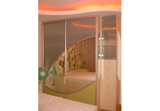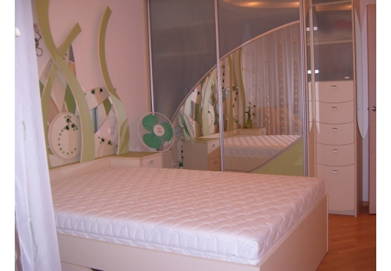 Дополнительно: Корпус - ДСП ламинированное «Kronopol» (Польша) – цвет "клён натуральный". Фасады - ДСП ламинированное «Kronopol» (Польша) – цвет "зелёный светлый", "бежевый светлый". Кровать 2-х спальная с декоративной композицией