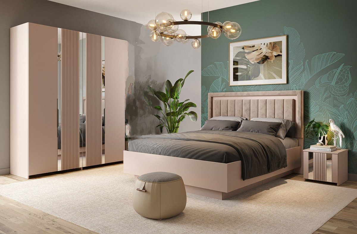 Отличительной чертой спальни являются вставки из МДФ облицованные плёнкой ПВХ, которые прикреплены на фасадах тумбы, комода, шкафа и лицевой части кровати.