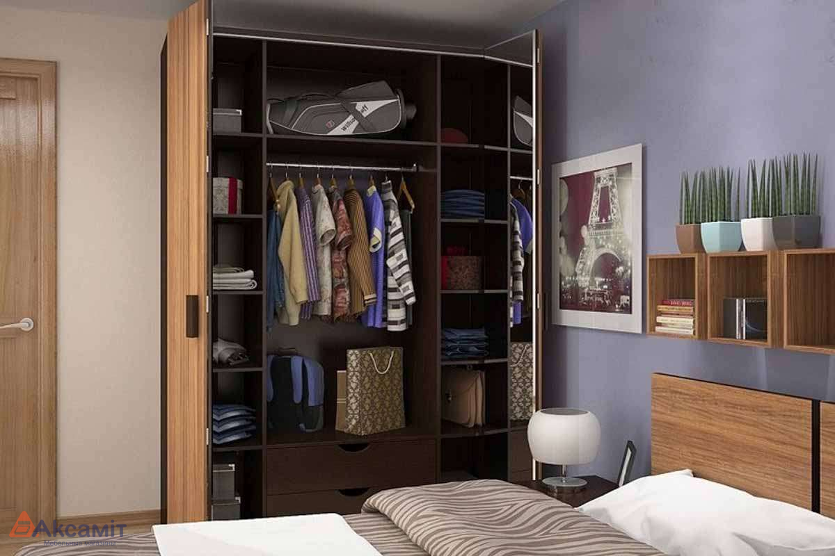 В комплекте шкаф с глянцевым фасадом и кровать.