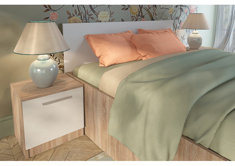 Корпус спальни изготовлен из 16 мм ламинированной древесностружечной плиты цвет –«Белый» и «Дуб Сонома». Торцевые поверхности корпуса закромлены кромками полипропилен. Фасады изготовлены из 16 мм ламинированной древесностружечной плиты цвет –«Белый» и «Дуб Сонома».