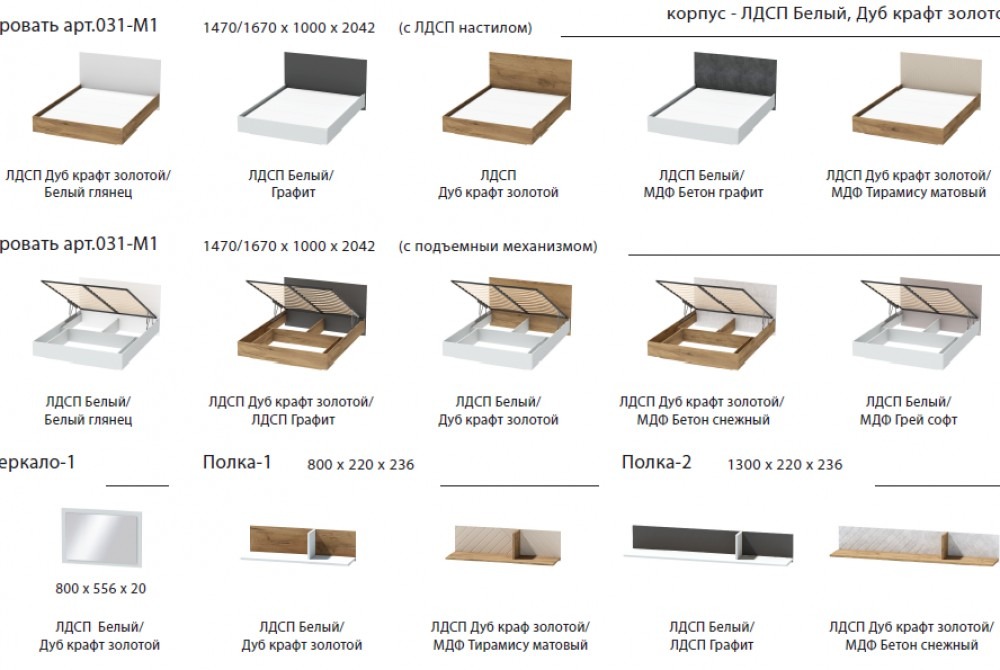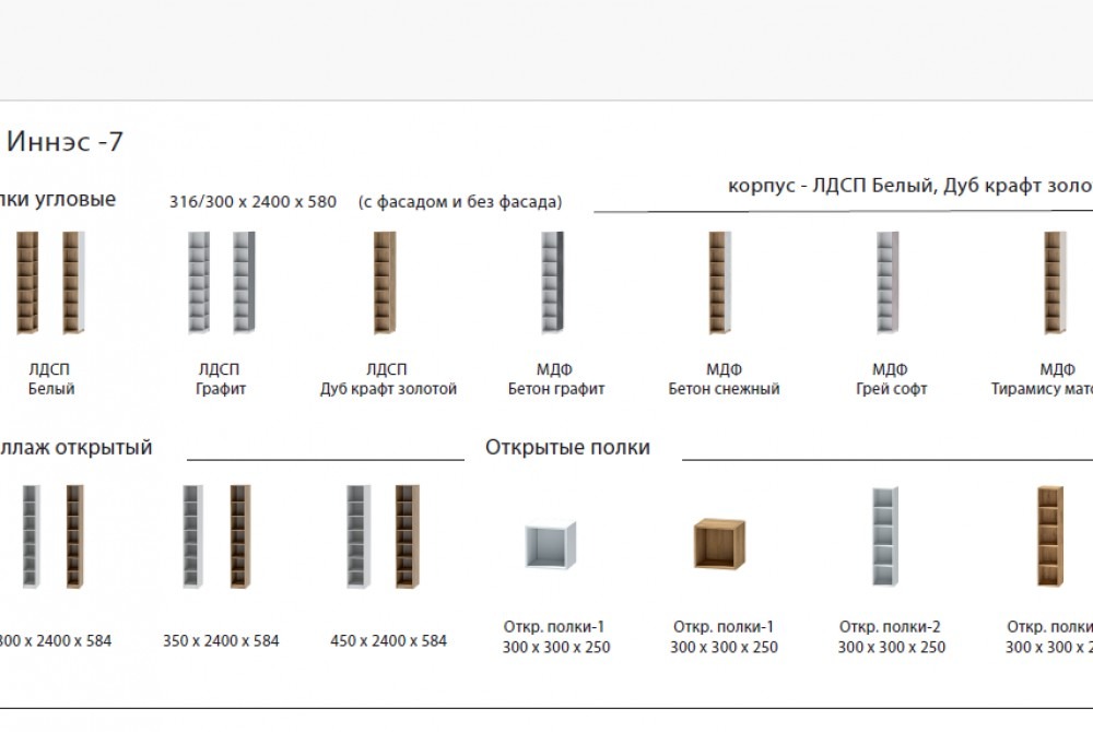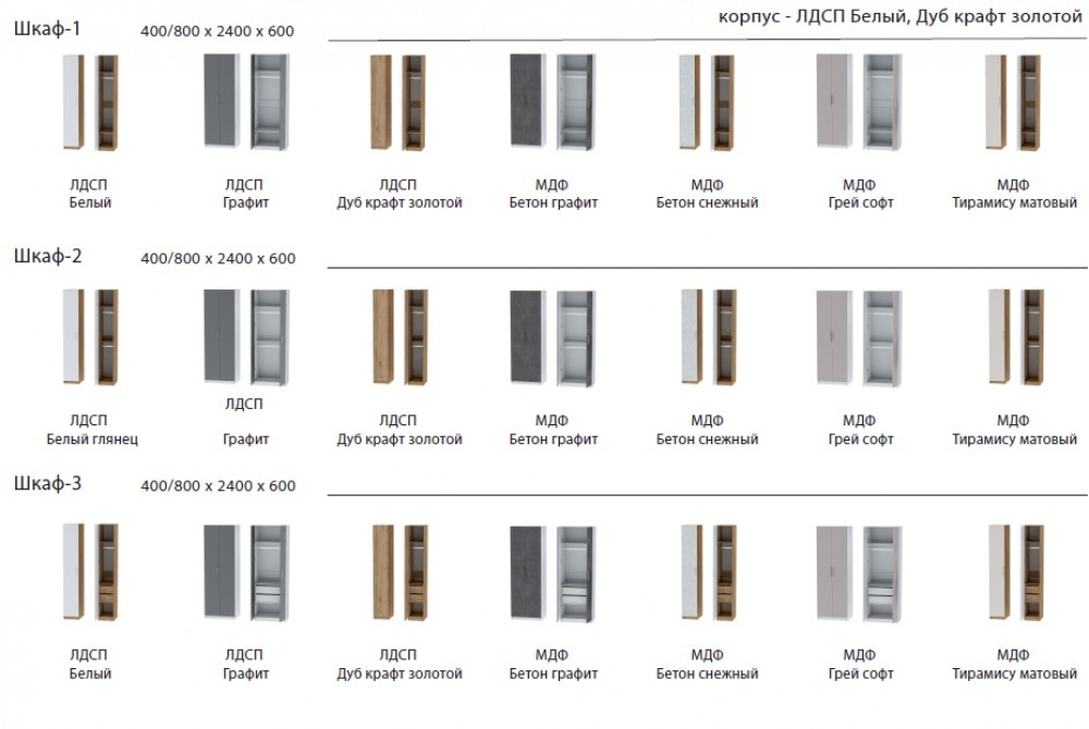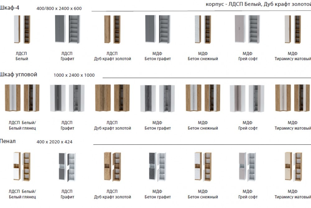 Фасады ЛДСП: дуб крафт золотой, графит, белый, белый глянец