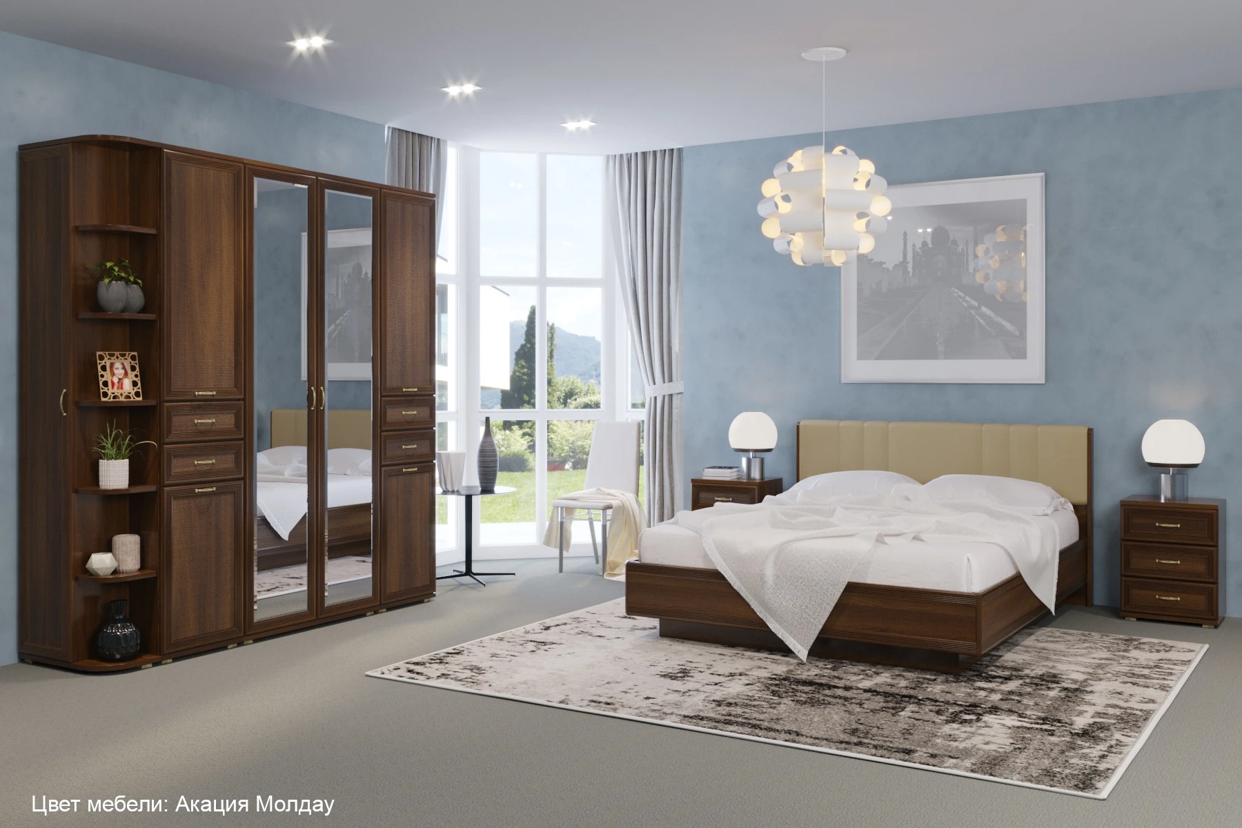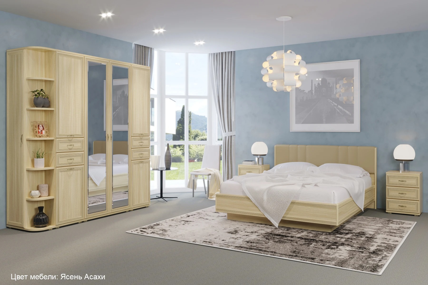 В комплекте: шкаф, кровать, комод, прикроватные тумбы.