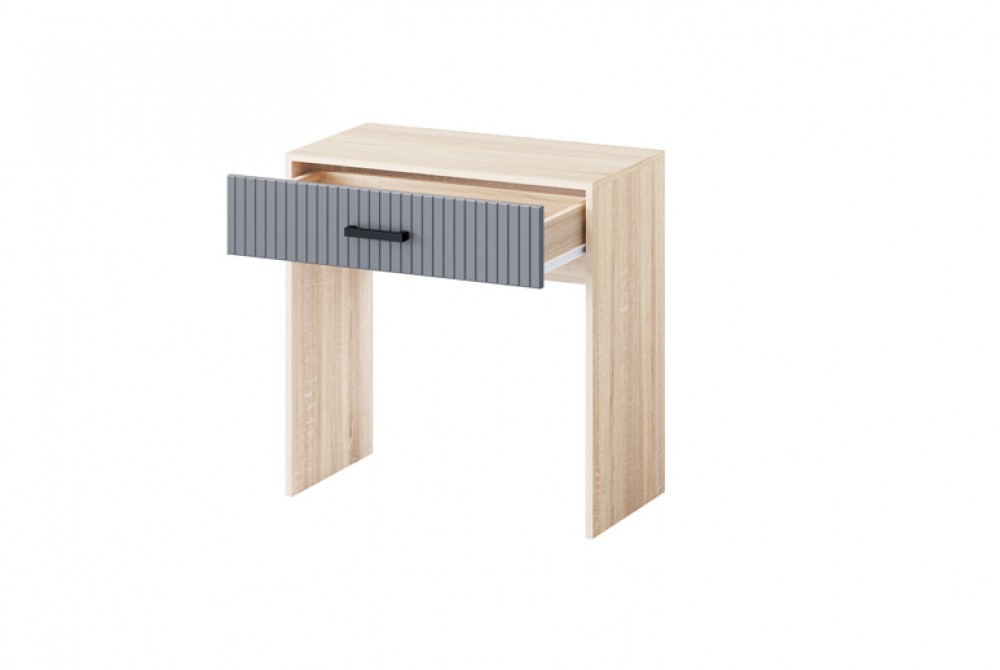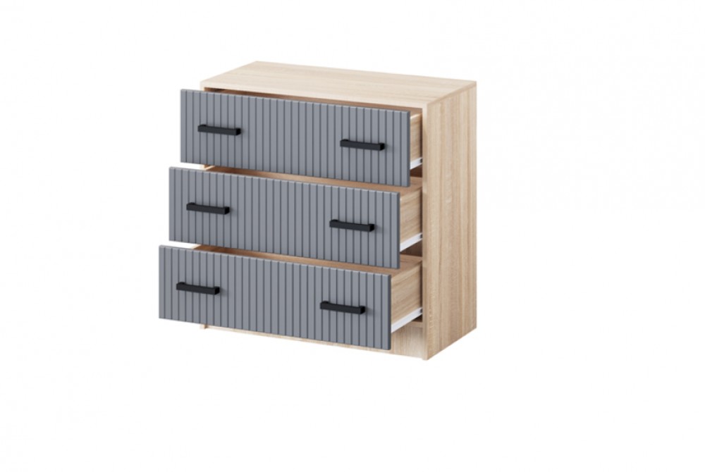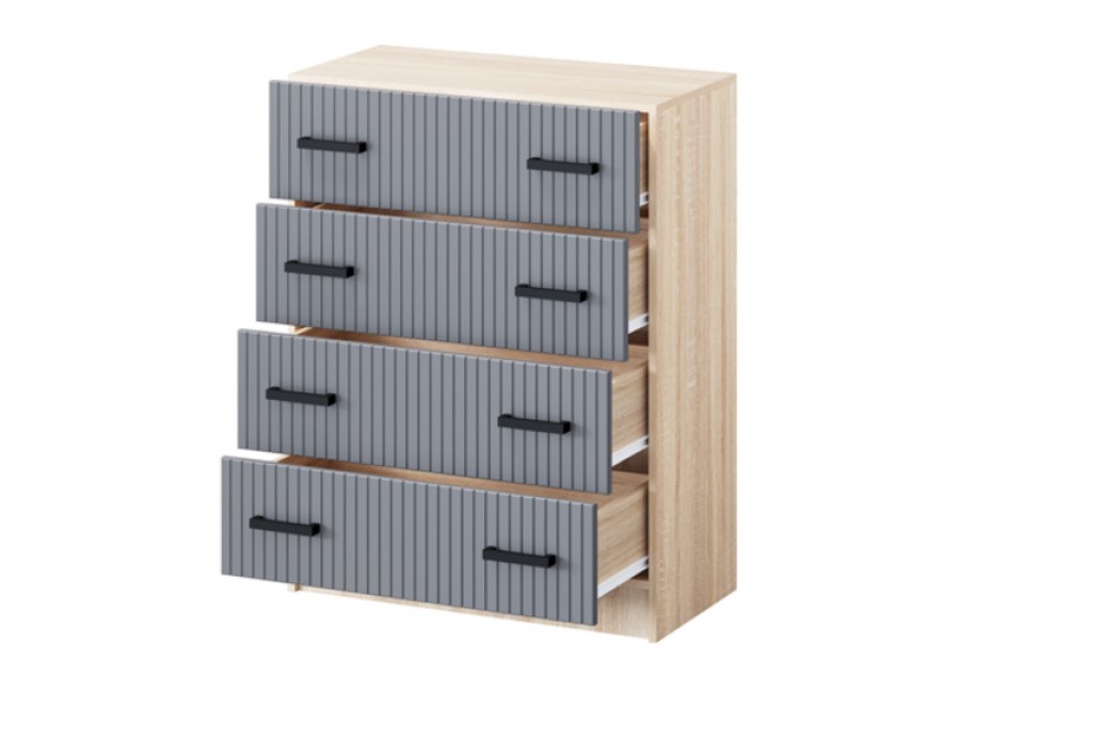 Строгие линии форм, сочетание гладкости и фрезеровки фасадов, изящные опоры. Материал: МДФ, ЛДСП.