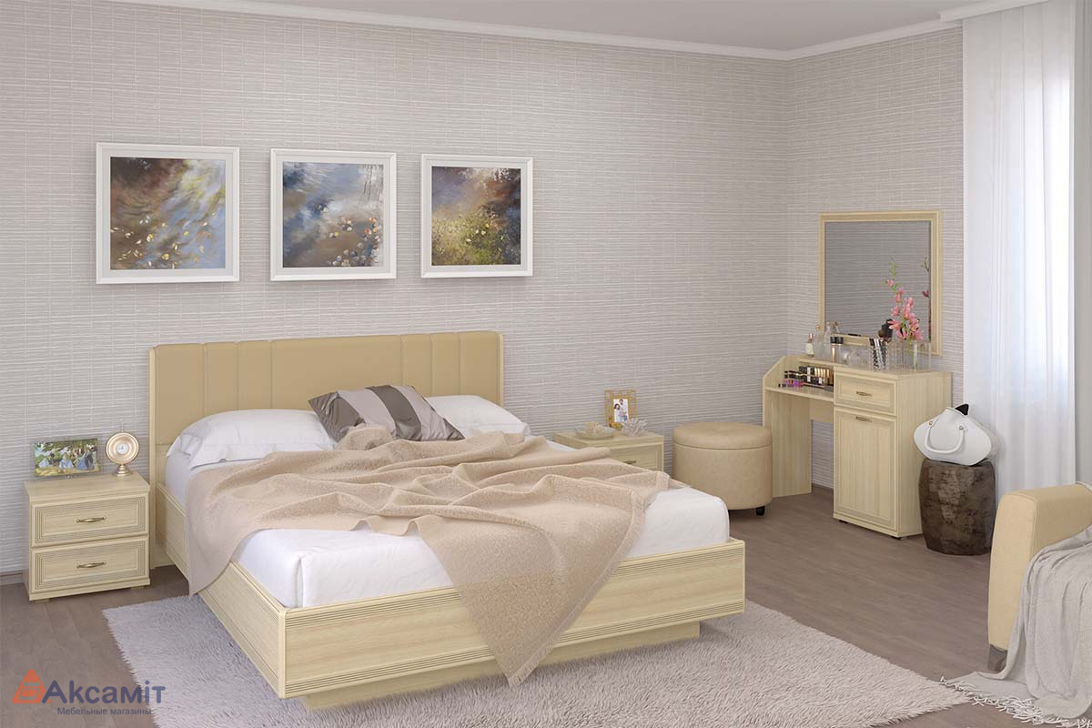 Кровать с выдвижными ящиками, шкаф-купе, комод, туалетный столик с зеркалом.