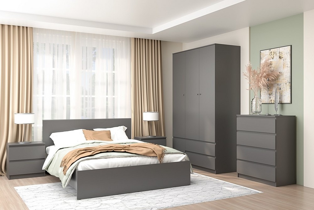 Комплектация: кровать двуспальная, тумба, шкаф двухстворчатый. Материал: ЛДСП.