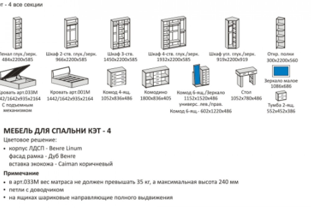 Кэт 4 - спальный гарнитур, выполненный в современном стиле. Можно выбирать модули в зависимости от размеров спальни и пожеланий покупателя. Направляющие полного выдвижения, петли с доводчиком, приятный цвет, кожаные вставки обеспечивают бесшумность, комфорт и уют.
