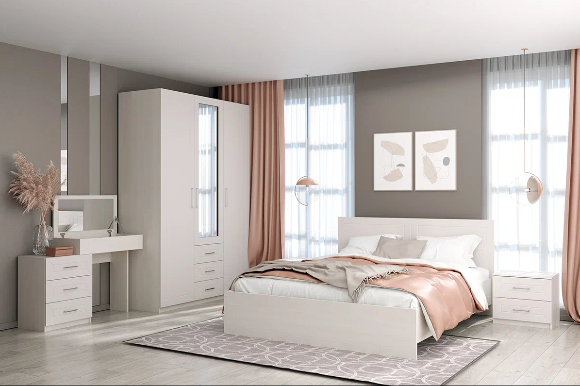 Цена указана на комплектацию спальни, которая показана на первой картинке (шкаф 3-х ств., кровать с настилом (спальное место 1,6*2), стол туалетный, две тумбы).