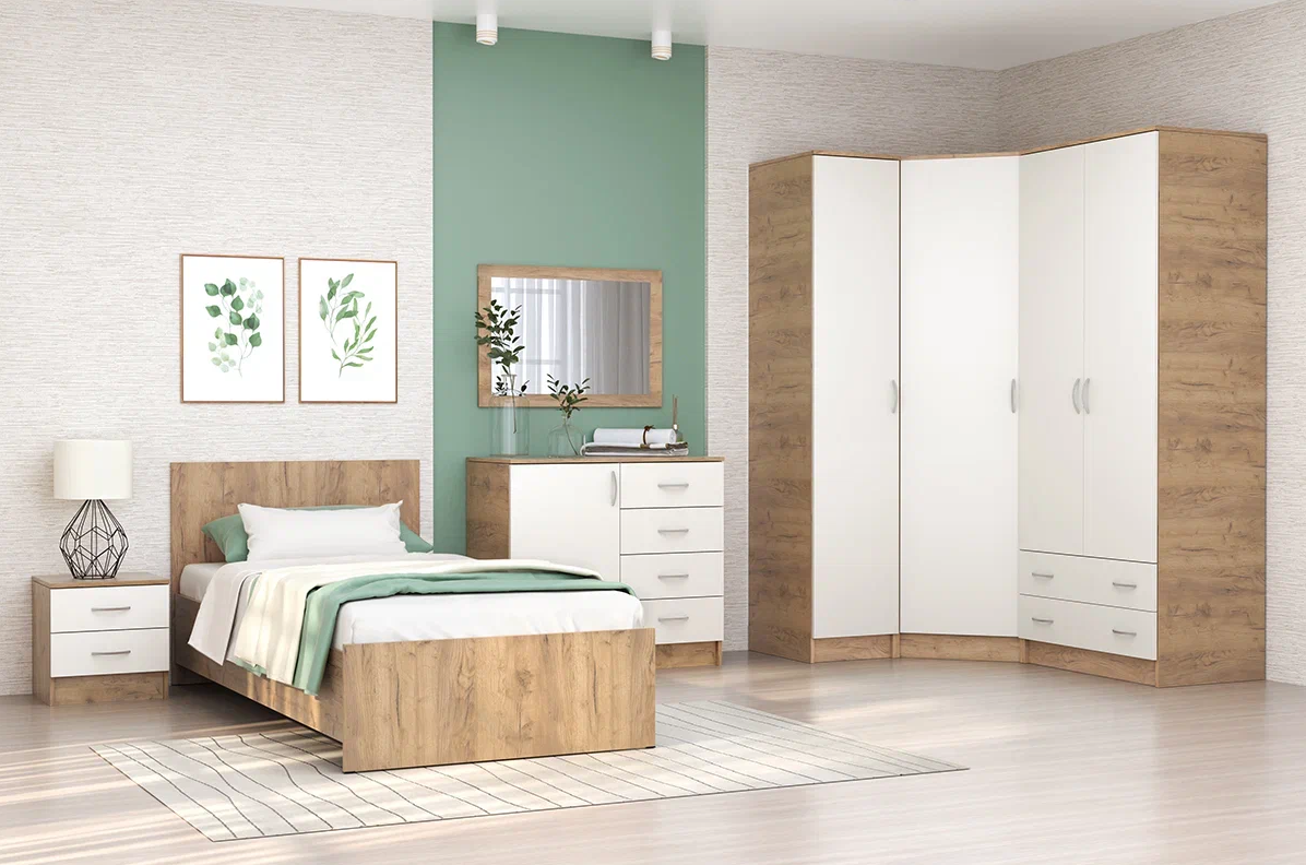 Цена указана на комплектацию спальни, которая показана на первой картинке (шкаф 2-х ств., шкаф угловой, пенал, кровать (спальное место 0,9*2), комод 1 ств. ящ., тумба, зеркало).