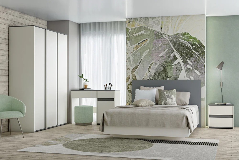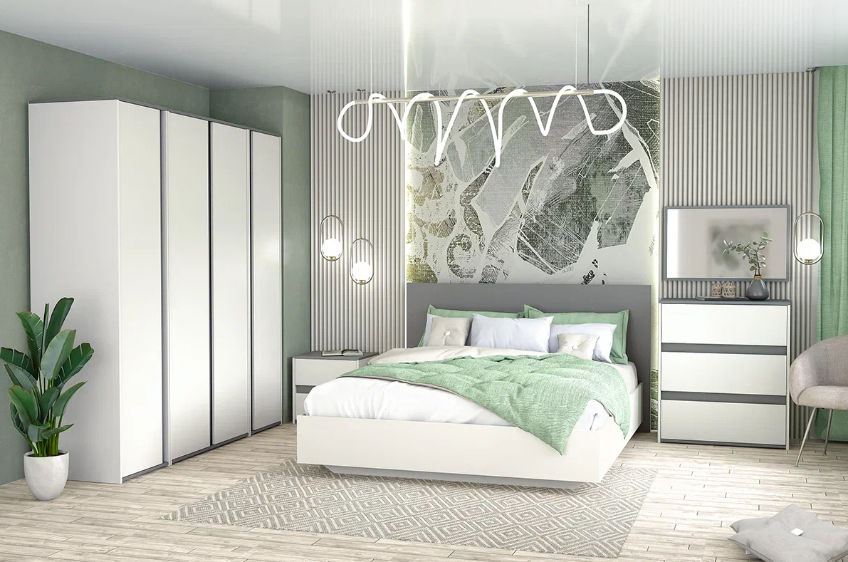 Модульная коллекция мебели для обустройства спальной комнаты. Материал: ЛДСП, МДФ покрытый плёнкой.