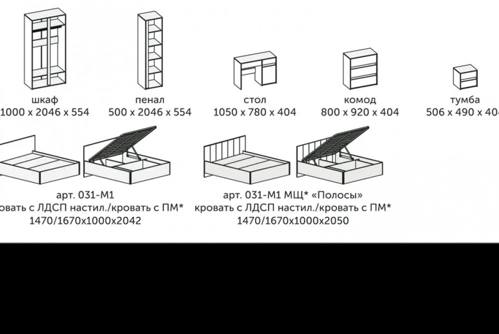 Цена указана на комплектацию спальни, которая показана на первой картинке (шкаф, два пенала, кровать с настилом (спальное место 1,6*2), комод, тумба, зеркало.