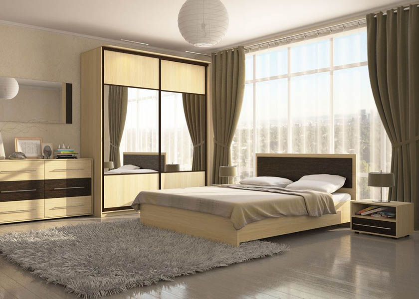 Кровать с выдвижными ящиками, шкаф-купе, комод, туалетный столик с зеркалом.
