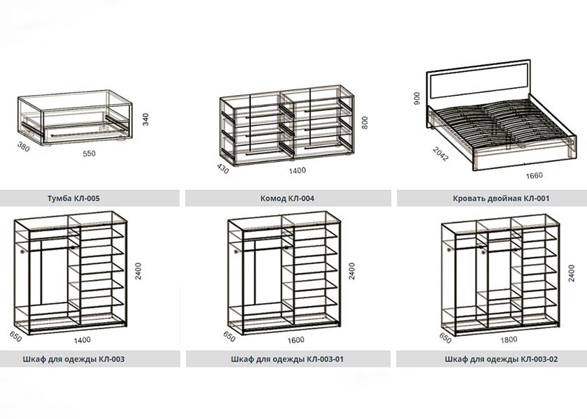 Ориентировочная цена указана за набор мебели с фото: кровать КЛ-001, зеркало КЛ-002, шкаф КЛ-003-01, комод КЛ-004, две тумбы КЛ-005. Матрас в комплект не входит, выбрать желаемую модель можно здесь.
