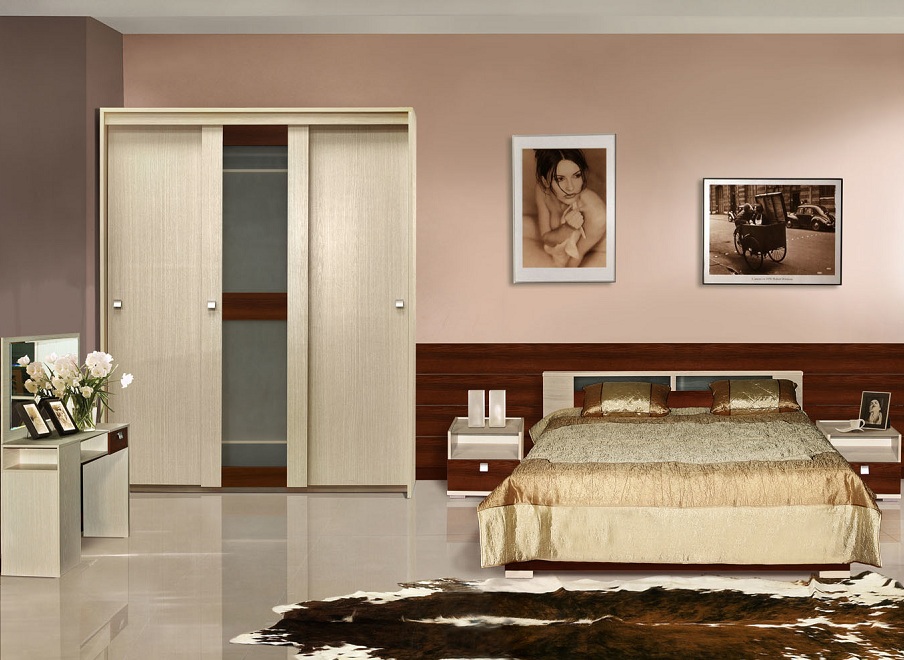 Современный гарнитур для спальни, изготовленный из ламинированной ДСП.