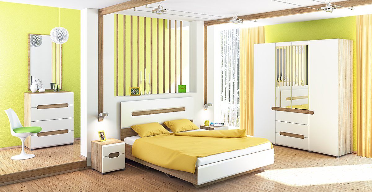 Уютная и лаконичная коллекция для спальни, располагающая к отдыху. Материал: МДФ, ЛДСП.