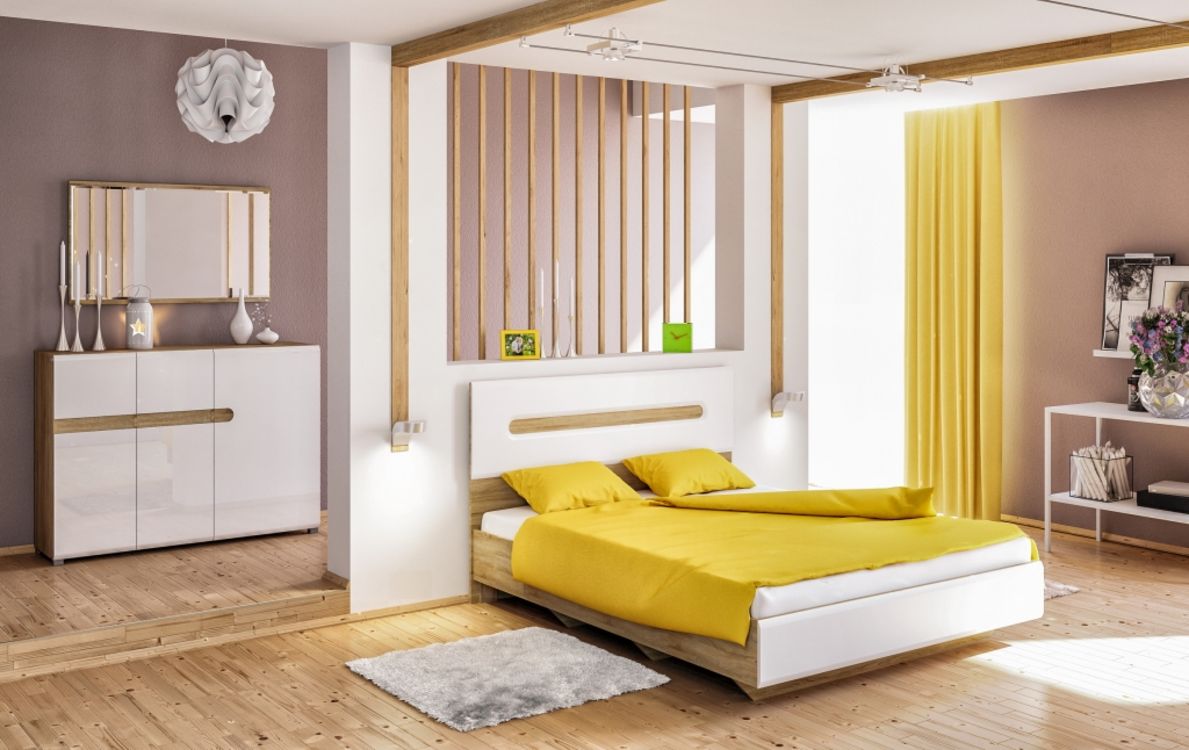 Комплектация: кровать двуспальная, тумба, шкаф двухстворчатый. Материал: ЛДСП.