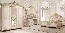 Все предметы мебели выполнены в едином стиле с легким узором на фасадах.