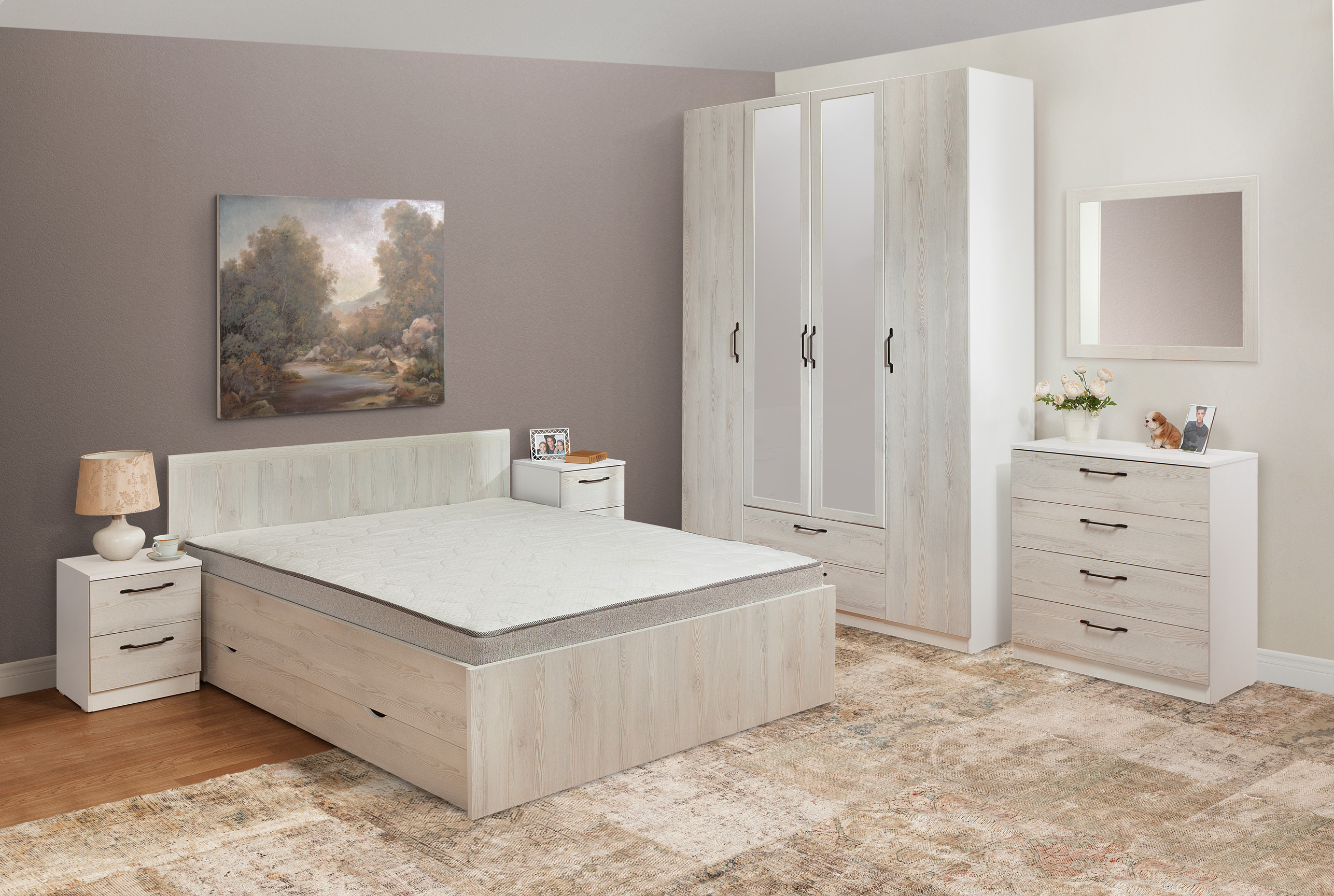 Состав комплекта: комод, шкаф, двуспальная кровать, тумба (2 шт).