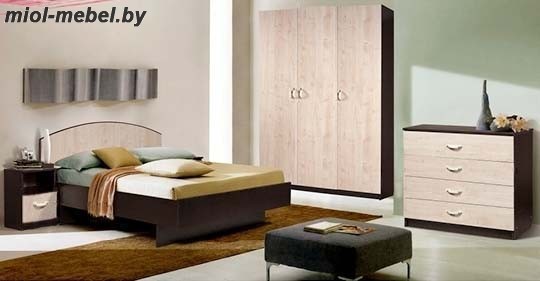 Набор включает в себя кровать, шкаф для одежды, комод, 2 прикроватные тумбы.