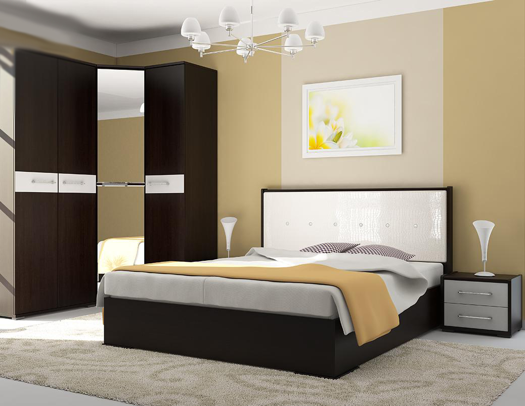 Просторная спальня с угловым шкафом. В наборе есть все, что может пригодится в спальной комнате. Светлые вставки в дизайне шкафа контрастируют с общим темным тоном комплекта, что создает привлекательную отличительную черту.