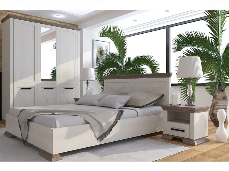 Светлая спальня в прованском стиле выделяется необычным дизайном фасадов с фрезеровкой и массивными ручками. Декоративные планки из МДФ коричневого оттенка гармонично сочетаются с бежевым цветом фасадов и корпусов мебели. В набор входит большой распашной шкаф (внутри – отсек со штангой и полки), кровать с жестким изголовьем прямоугольной формы и две тумбы с выдвижным ящиком и нишей.