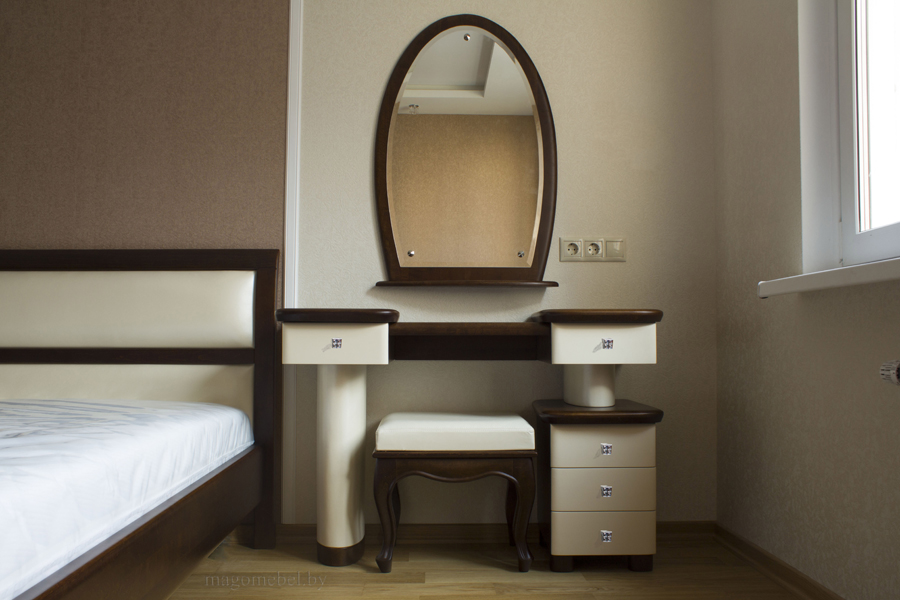 В своем комплекте гарнитур имеет все необходимые предметы: просторную кровать, прикроватную тумбочку, оригинальный туалетный столик с зеркалом. Исключение составляет шкаф, который отсутствует в комплекте. Его место в данном случае сможет занять длинная подвесная полка с выдвижными ящиками.