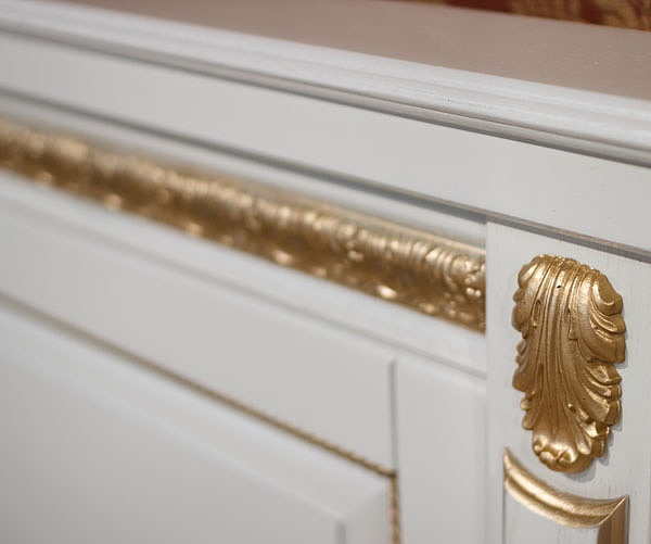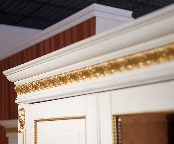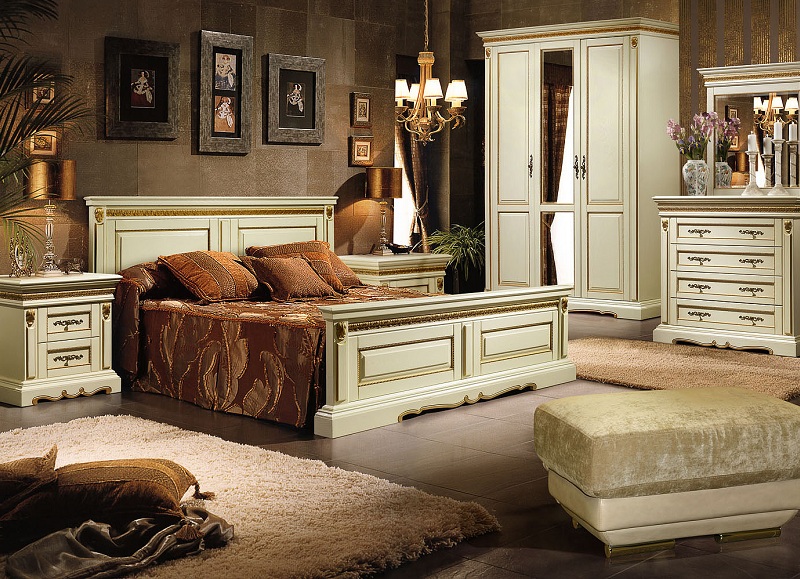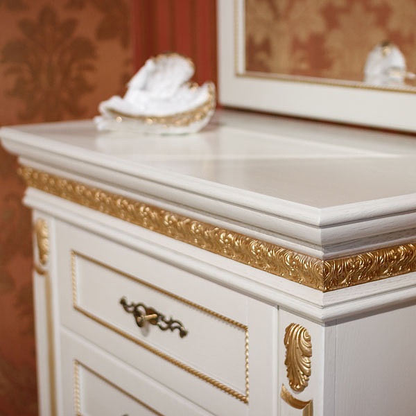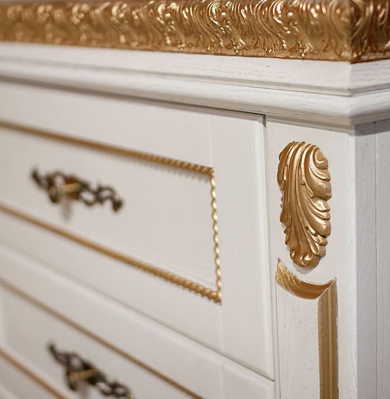 Спальный гарнитур «Милана» не оставит вас равнодушным. Весь гарнитур исполнен в цвете белого дуба с элементами декоративной резьбы с позолотой. Фасады облицованы натуральным шпоном. Модульная коллекция в классическом стиле, цвет - слоновая кость с золочением.