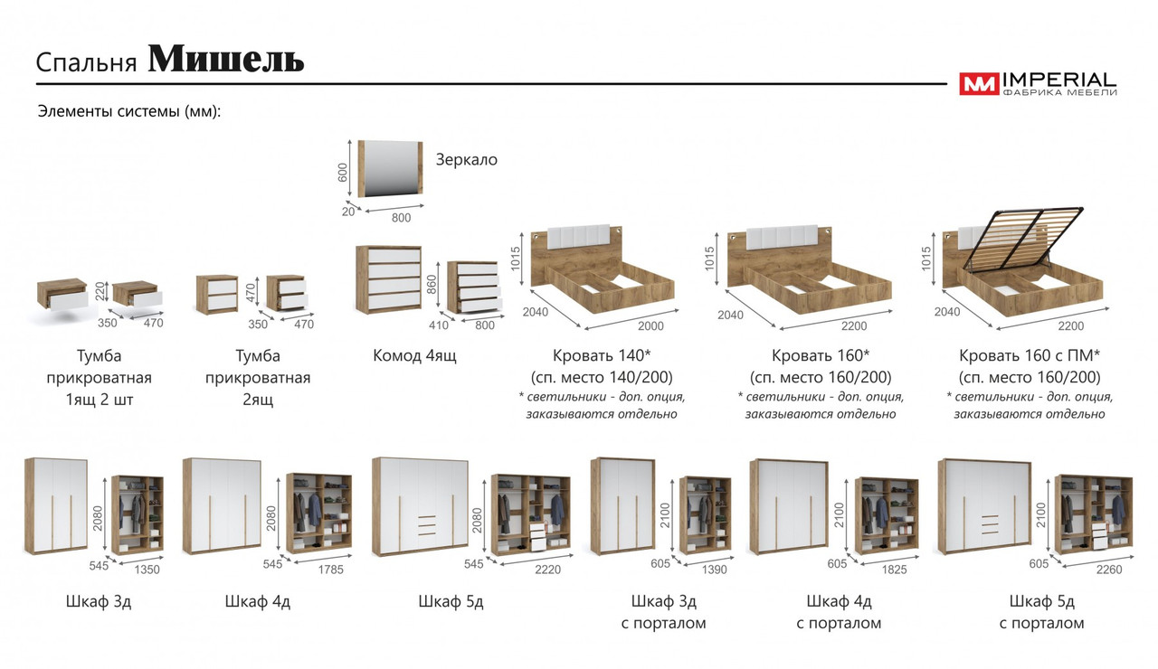 Мишель – это современная спальня с лаконичными формами и строгой геометрией в актуальных природных цветах. Оригинальная конструкция основания в сочетании со светодиодной подсветкой создают «эффект парения». Накладные светильники в комбинированном изголовье дают дополнительное освещение в ночное время, а мягкая накладка с вертикальной отстрочкой поддержит спину во время отдыха. Отсутствие лицевой фурнитуры в ящиках и комодах подчеркивают минималистичный дизайн спальни, а контрастные ручки шкафов оттеняют белизну фасадов.
