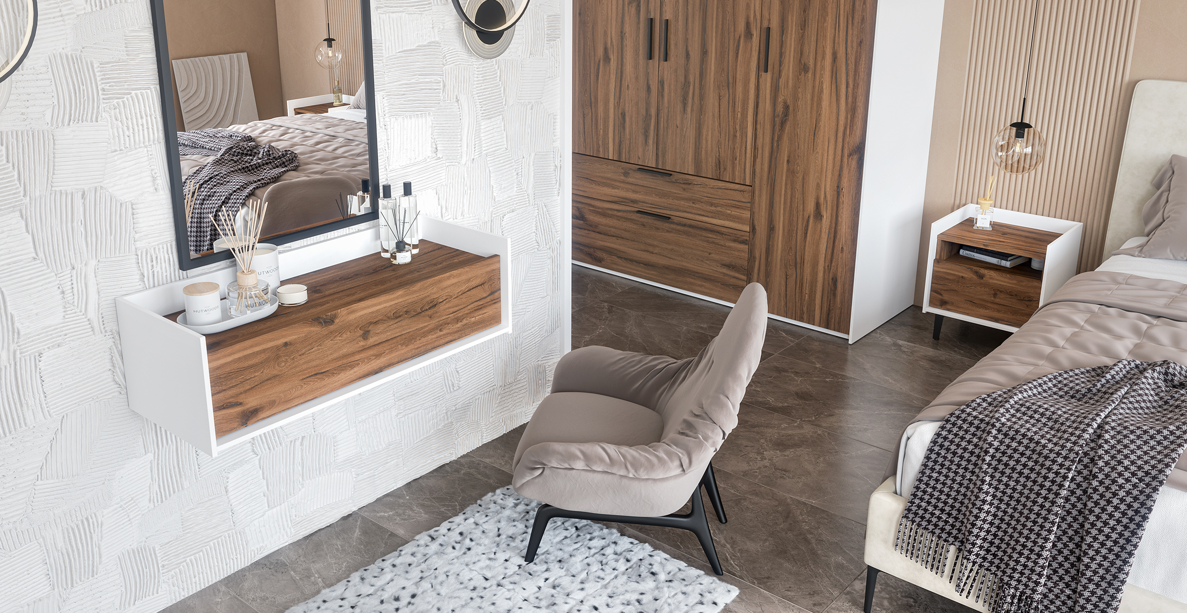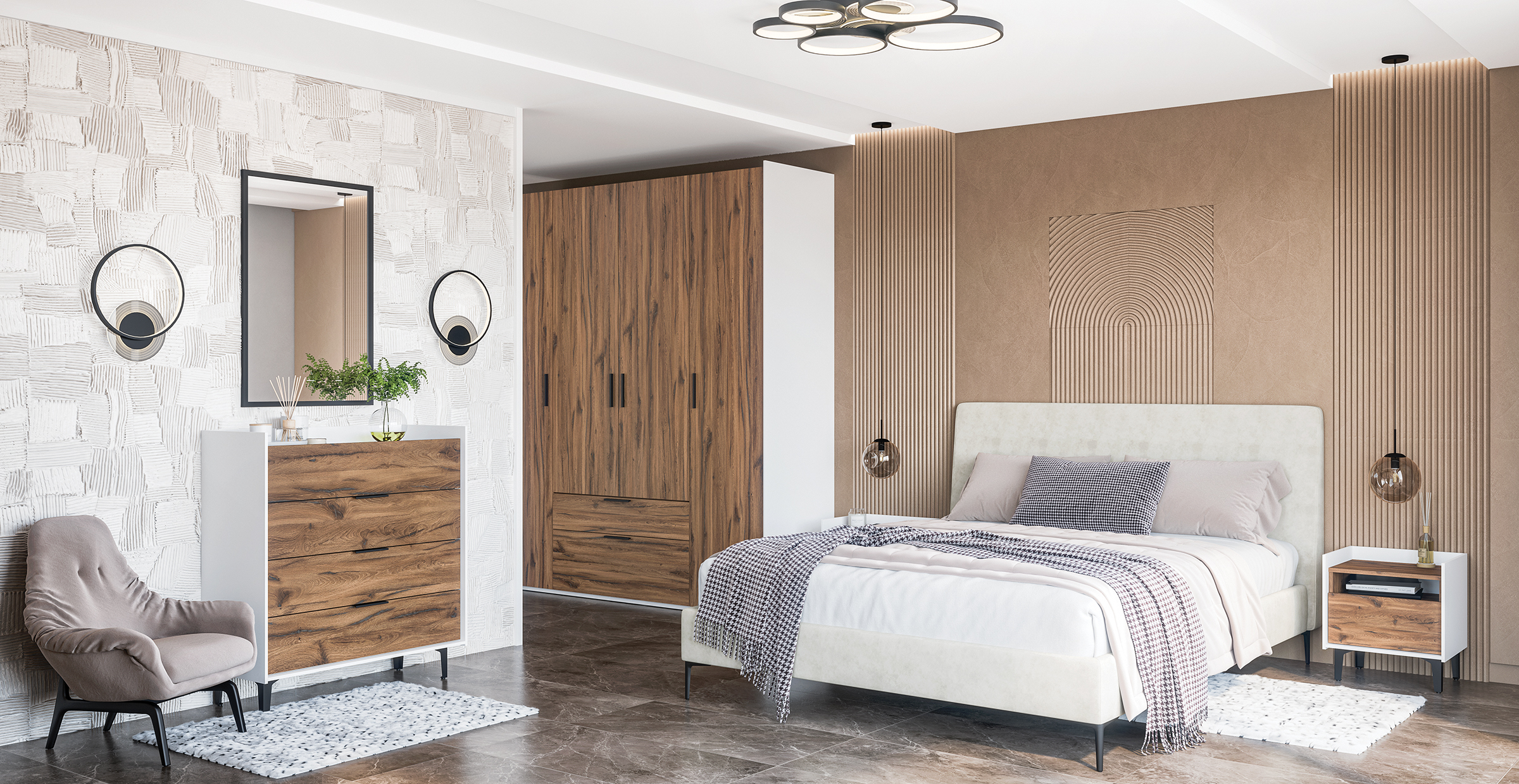 Модульная коллекция мебели для спальной комнаты. Материал: МДФ покрытый плёнкой, ЛДСП.