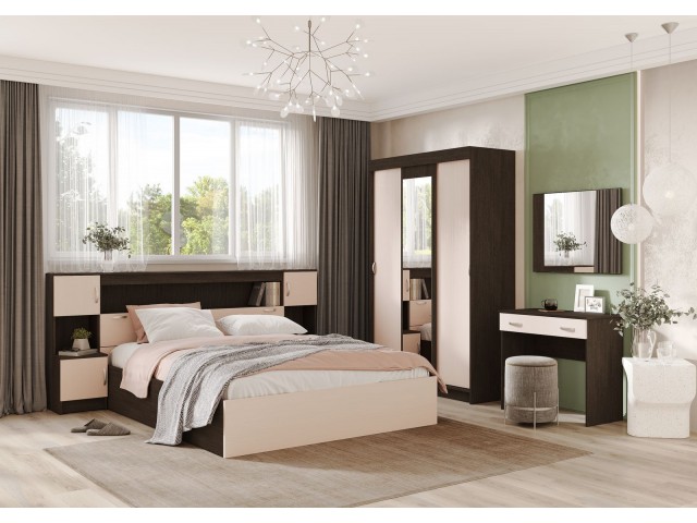 Состав набора: кровать с настилом, комод, шкаф-купе, тумба 2 шт.