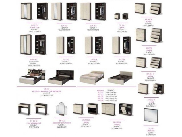 Модульная коллекция корпусной мебели для спальни. Материал: МДФ покрытый плёнкой, ЛДСП.